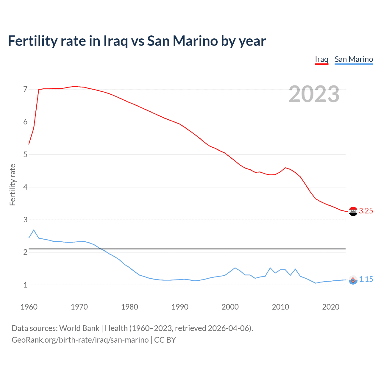 According to the latest available data on birth rates, the fertility rate in Iraq was 3.25 children per woman in 2023, compared to 1.15 in San Marino in 2023. The replacement level is considered to be 2.1 children per woman.