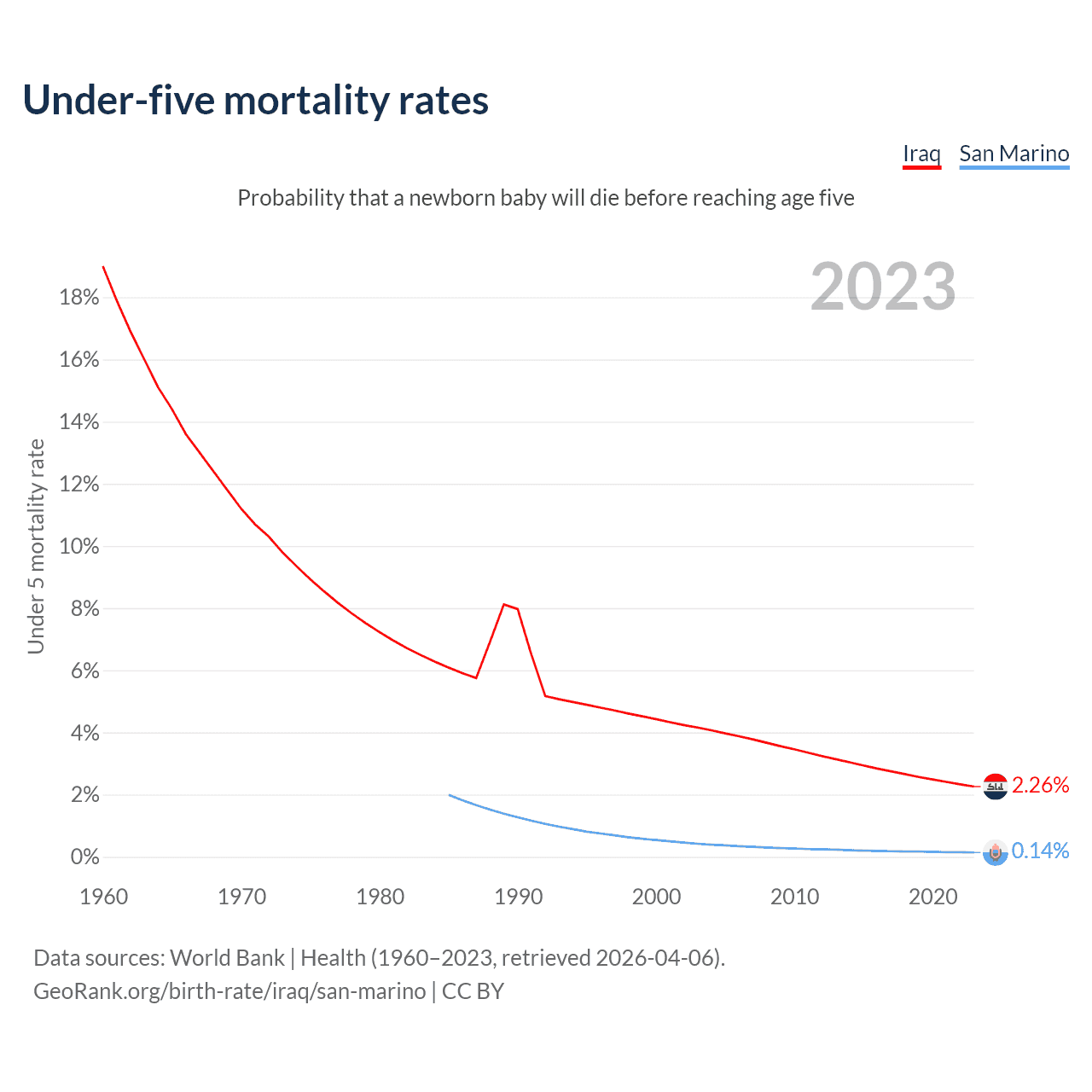 The chance that a newborn baby will die before reaching age five is 2.26% in Iraq and 0.14% in San Marino. Above is a chart with historical data on under-five mortality rates.