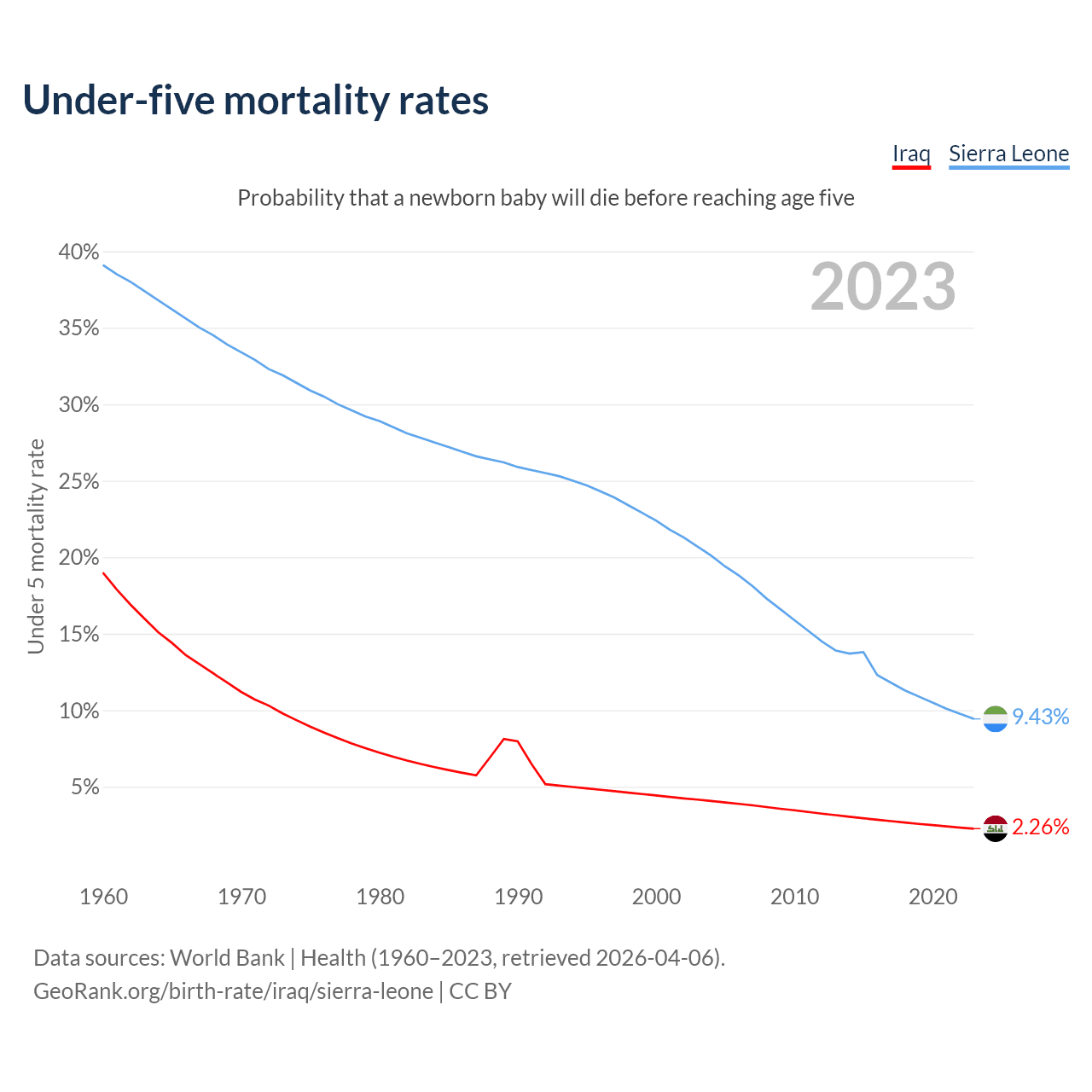 The chance that a newborn baby will die before reaching age five is 2.26% in Iraq and 9.43% in Sierra Leone. Above is a chart with historical data on under-five mortality rates.