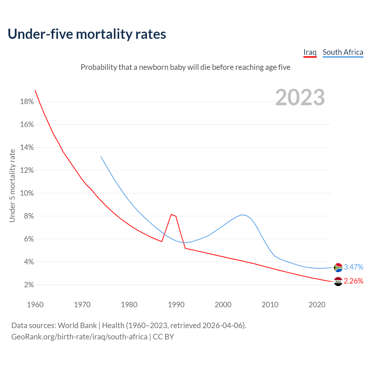 The chance that a newborn baby will die before reaching age five is 2.26% in Iraq and 3.47% in South Africa. Above is a chart with historical data on under-five mortality rates.