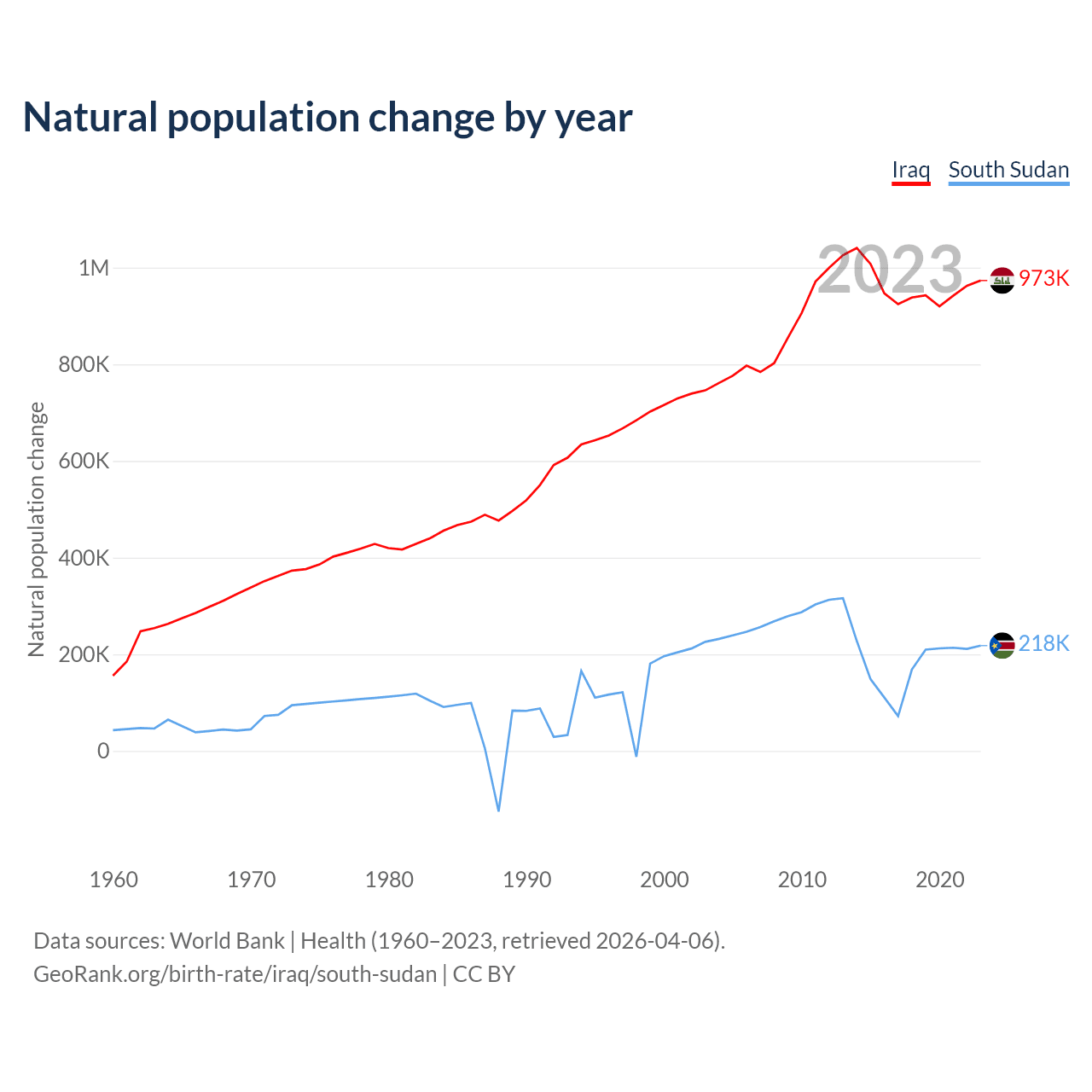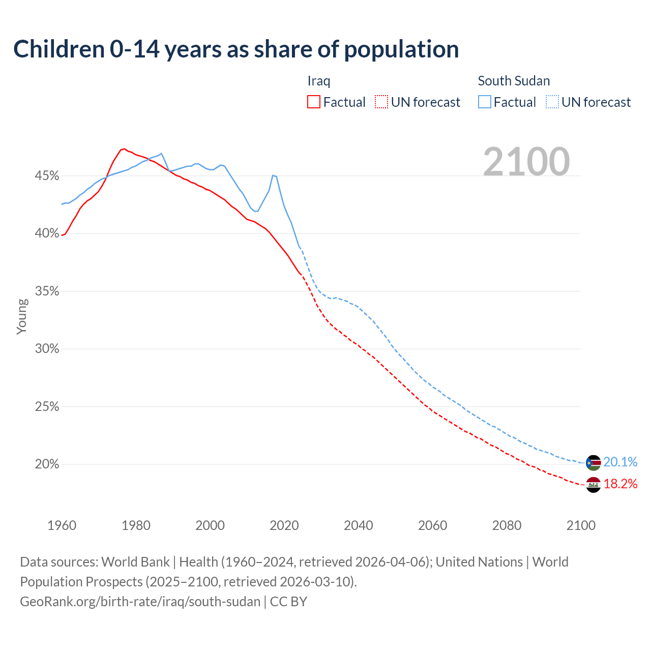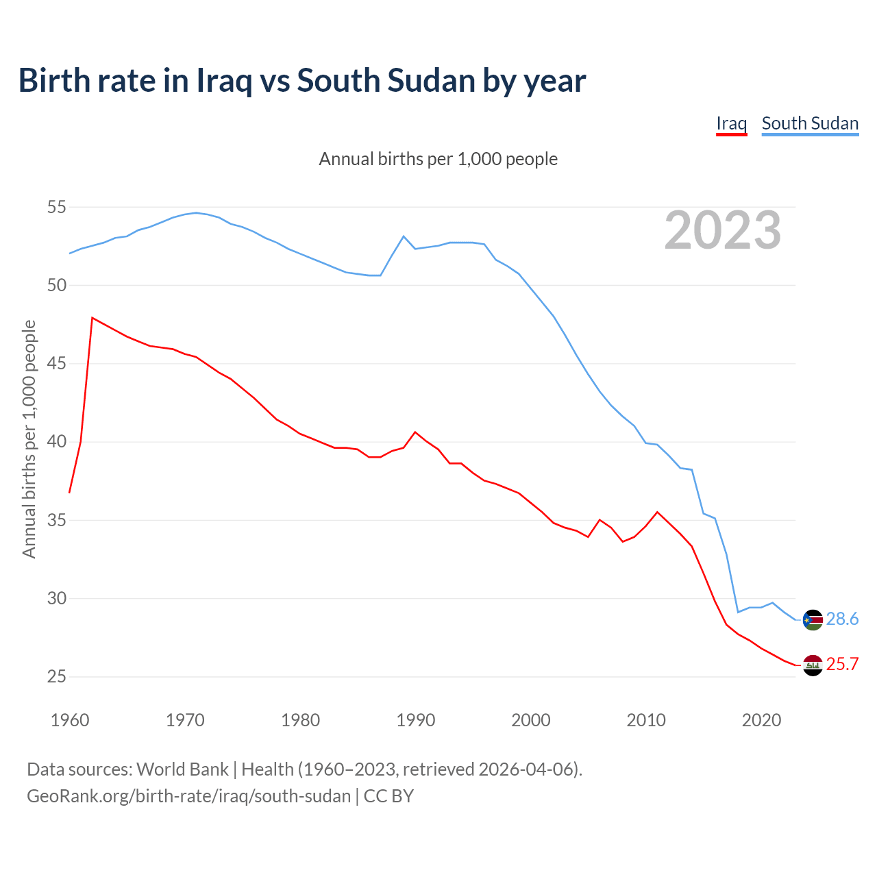 Iraq has an annual birth rate of 25.7 births per 1,000 people, compared to 28.6 for South Sudan. The average number of children a woman is expected to have during her lifetime — the fertility rate, is 3.25 in Iraq and 3.86 in South Sudan — 18.9% difference.