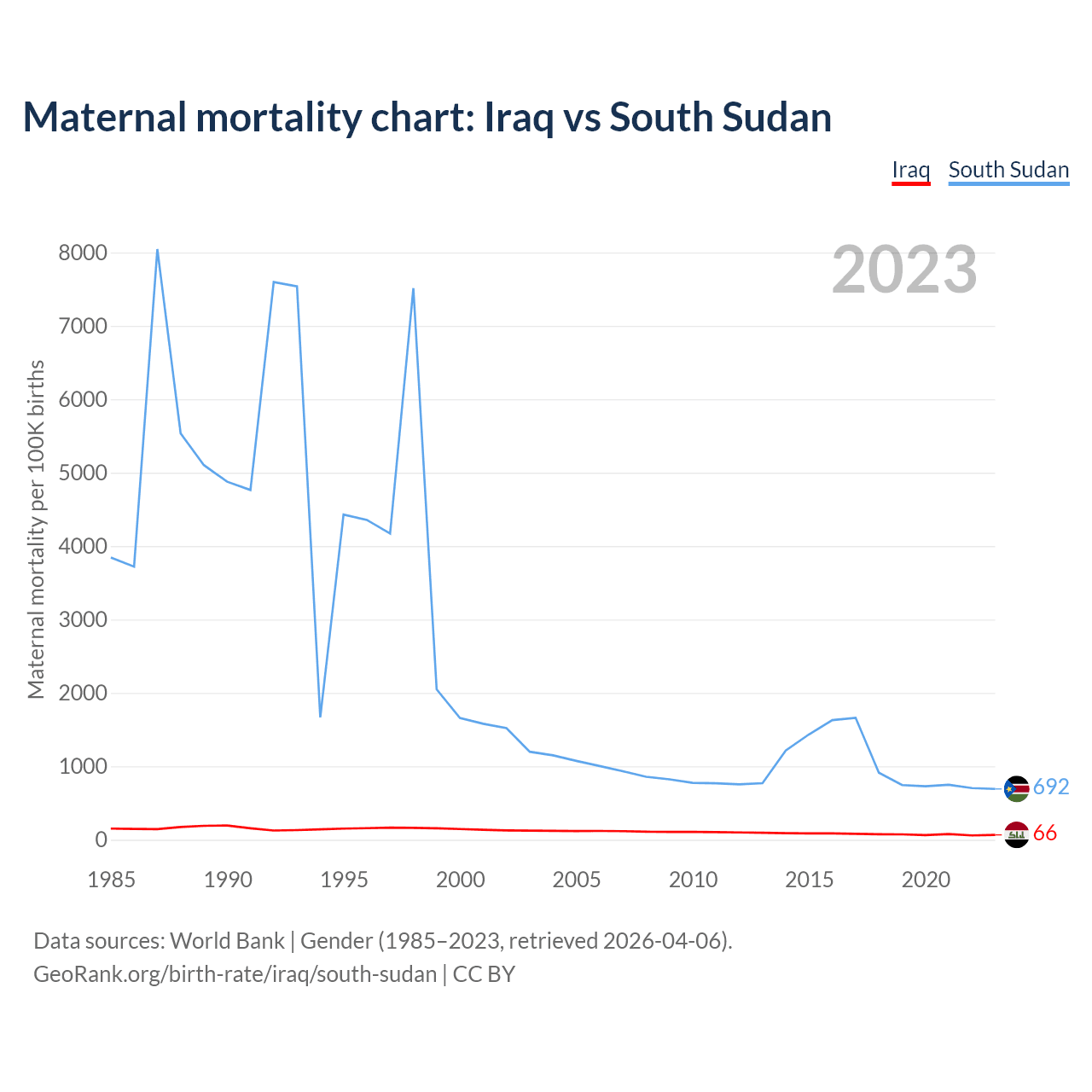 The maternal mortality rate, which is the probability of dying during childbirth or within 42 days of pregnancy termination, is 66 deaths per 100,000 live births in Iraq, compared to 692 deaths in South Sudan.