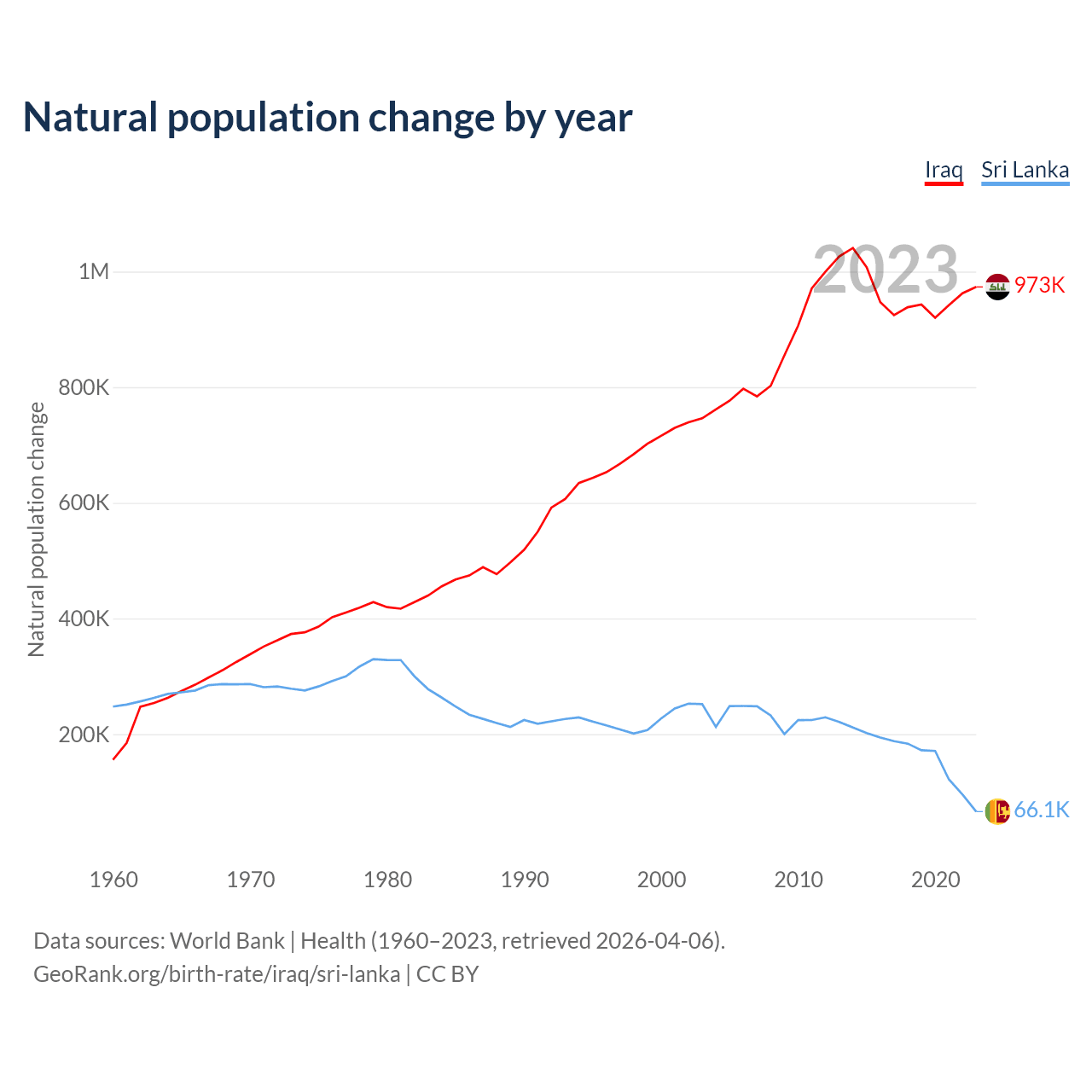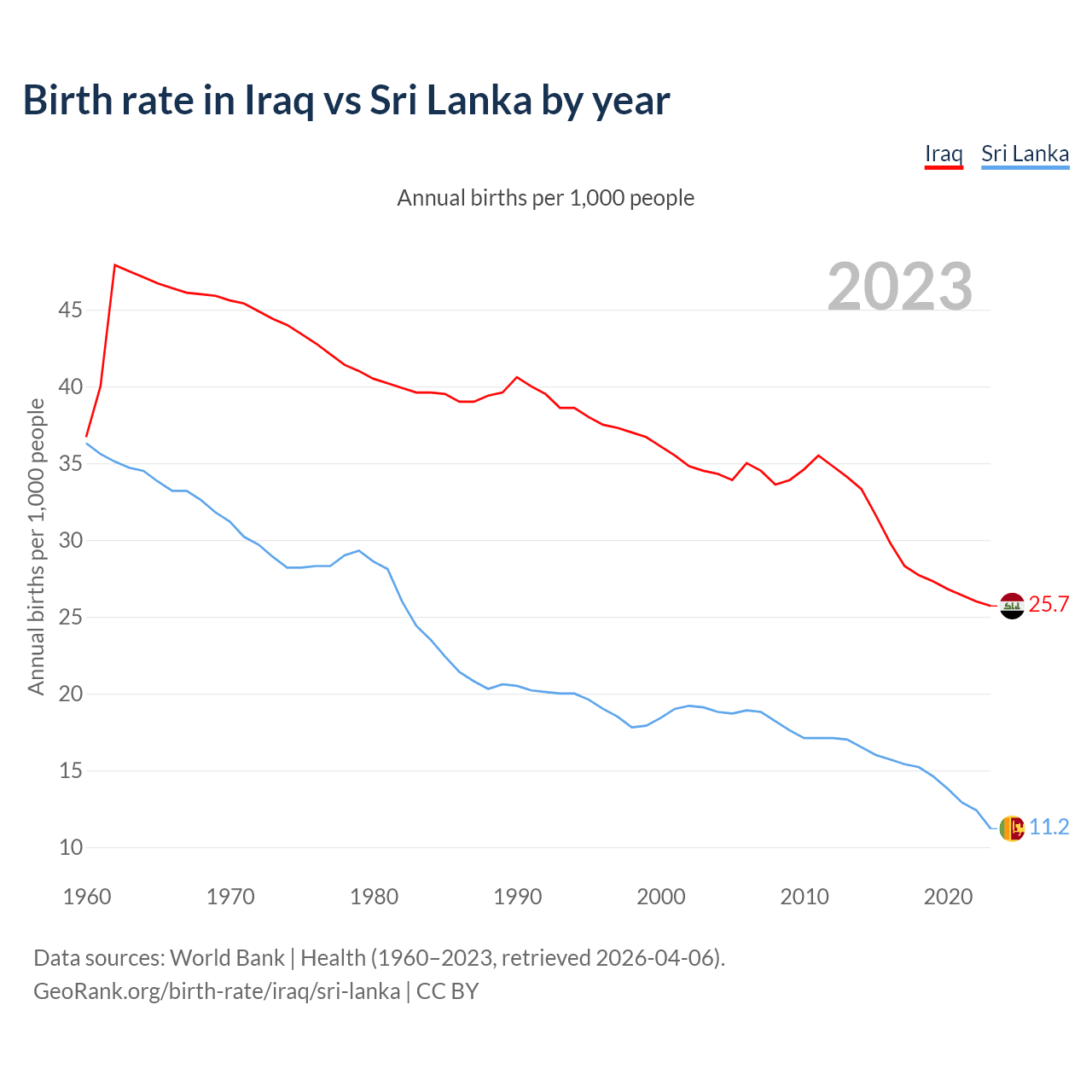According to the latest available data on birth rates, the fertility rate in Iraq was 3.25 children per woman in 2023, compared to 1.97 in Sri Lanka in 2023. The replacement level is considered to be 2.1 children per woman.