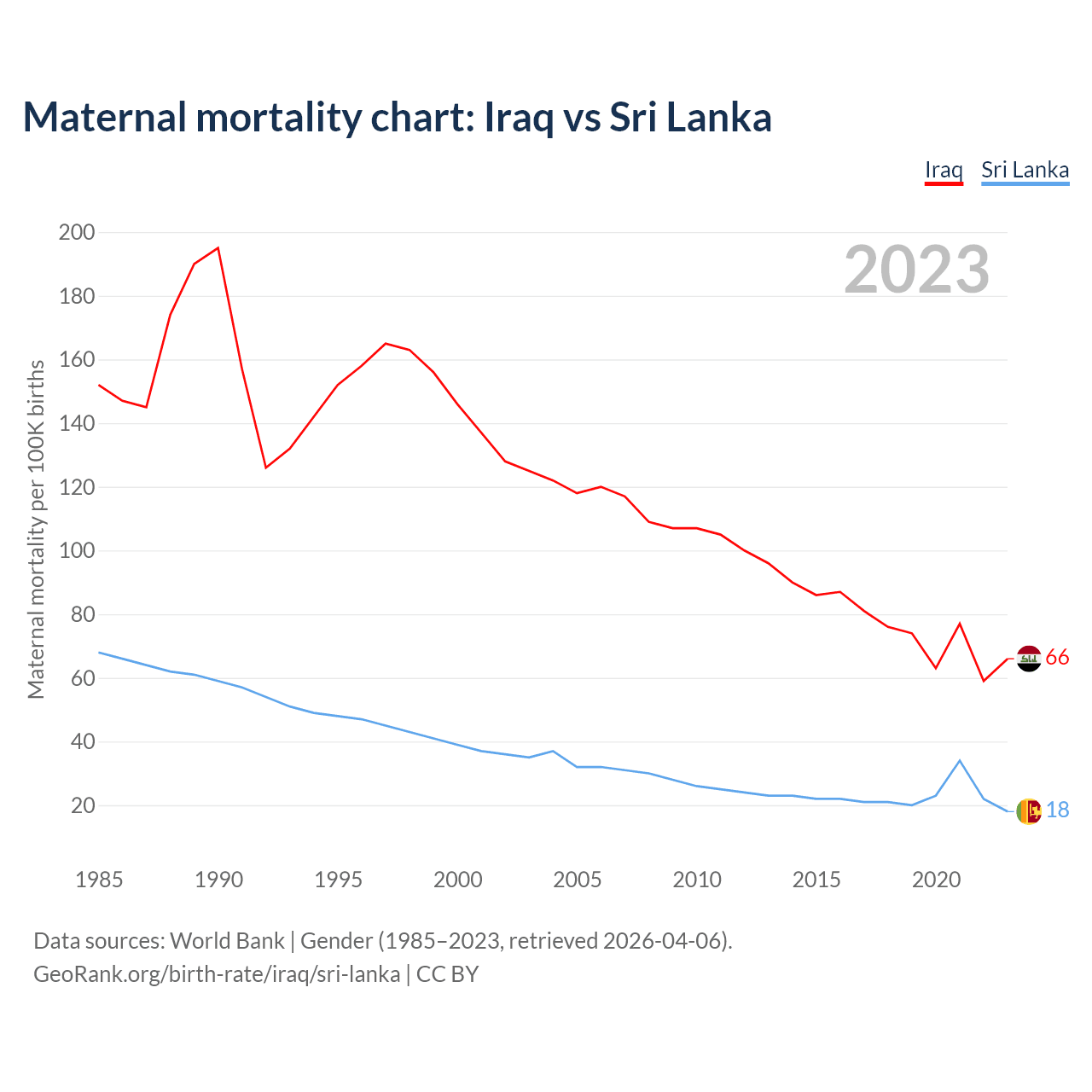 The maternal mortality rate, which is the probability of dying during childbirth or within 42 days of pregnancy termination, is 66 deaths per 100,000 live births in Iraq, compared to 18 deaths in Sri Lanka.