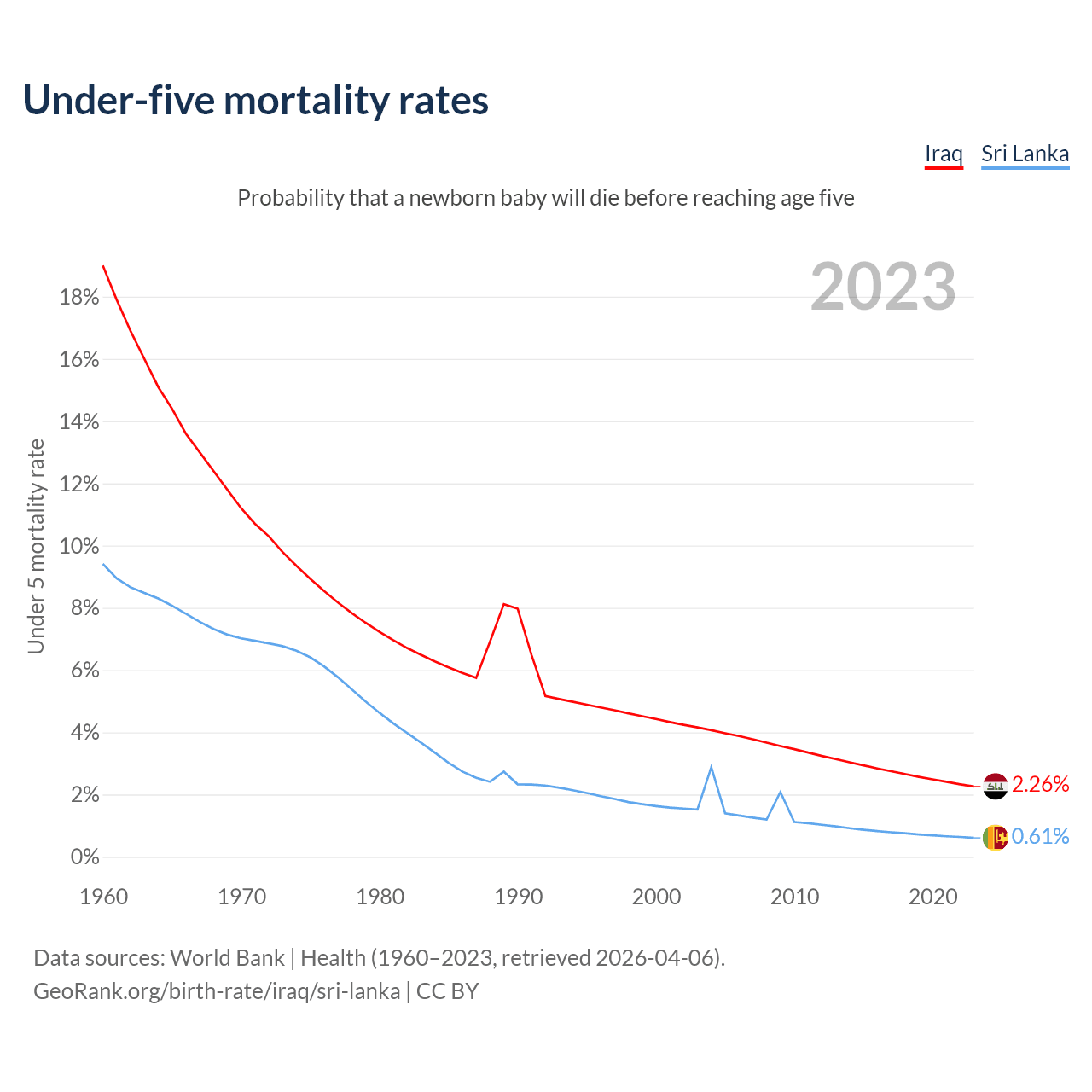 The chance that a newborn baby will die before reaching age five is 2.26% in Iraq and 0.61% in Sri Lanka. Above is a chart with historical data on under-five mortality rates.