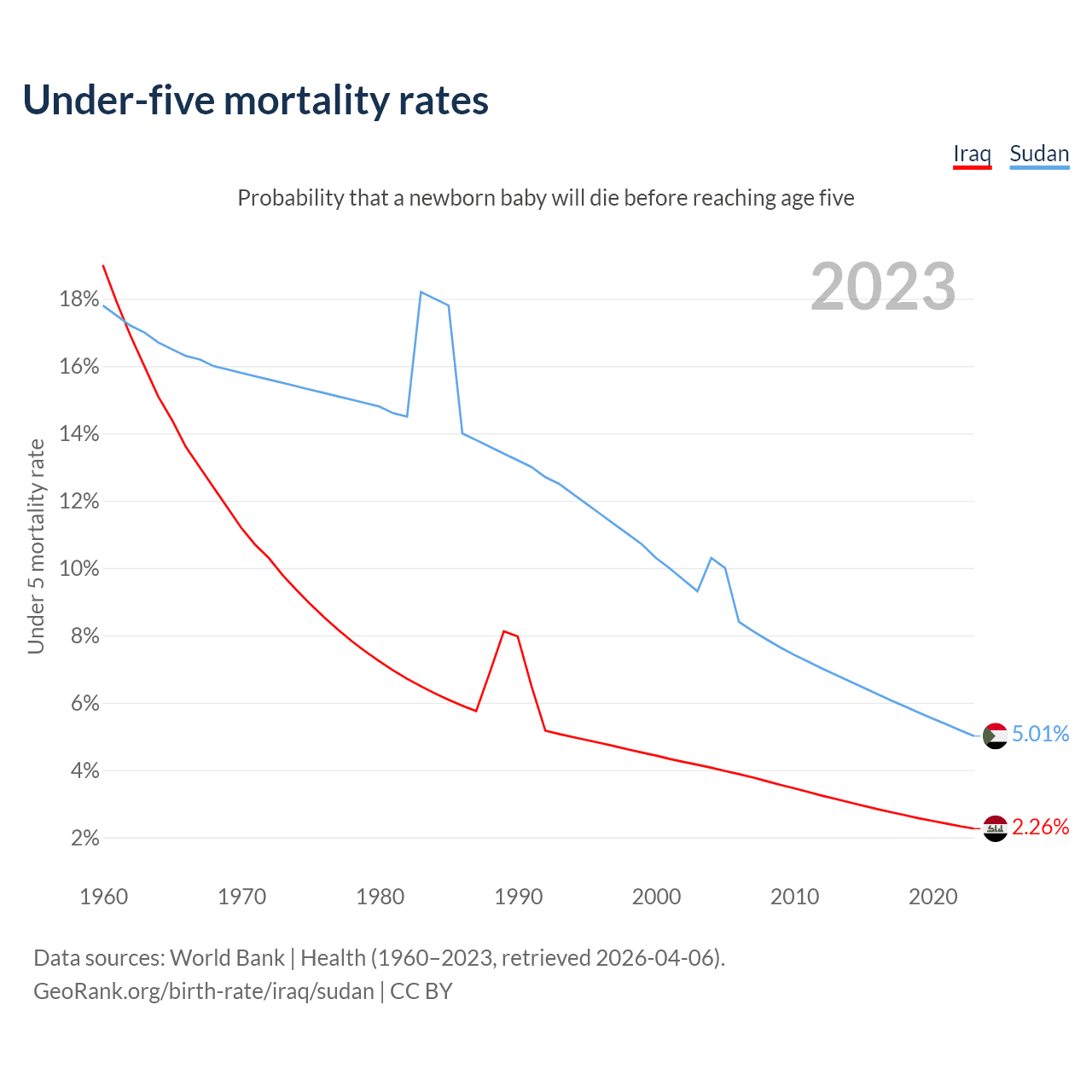 The chance that a newborn baby will die before reaching age five is 2.26% in Iraq and 5.01% in Sudan. Above is a chart with historical data on under-five mortality rates.