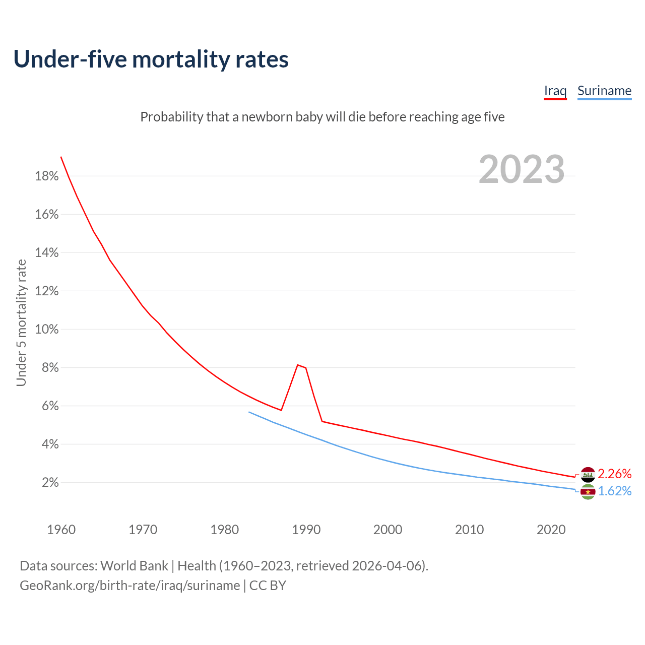The chance that a newborn baby will die before reaching age five is 2.26% in Iraq and 1.62% in Suriname. Above is a chart with historical data on under-five mortality rates.
