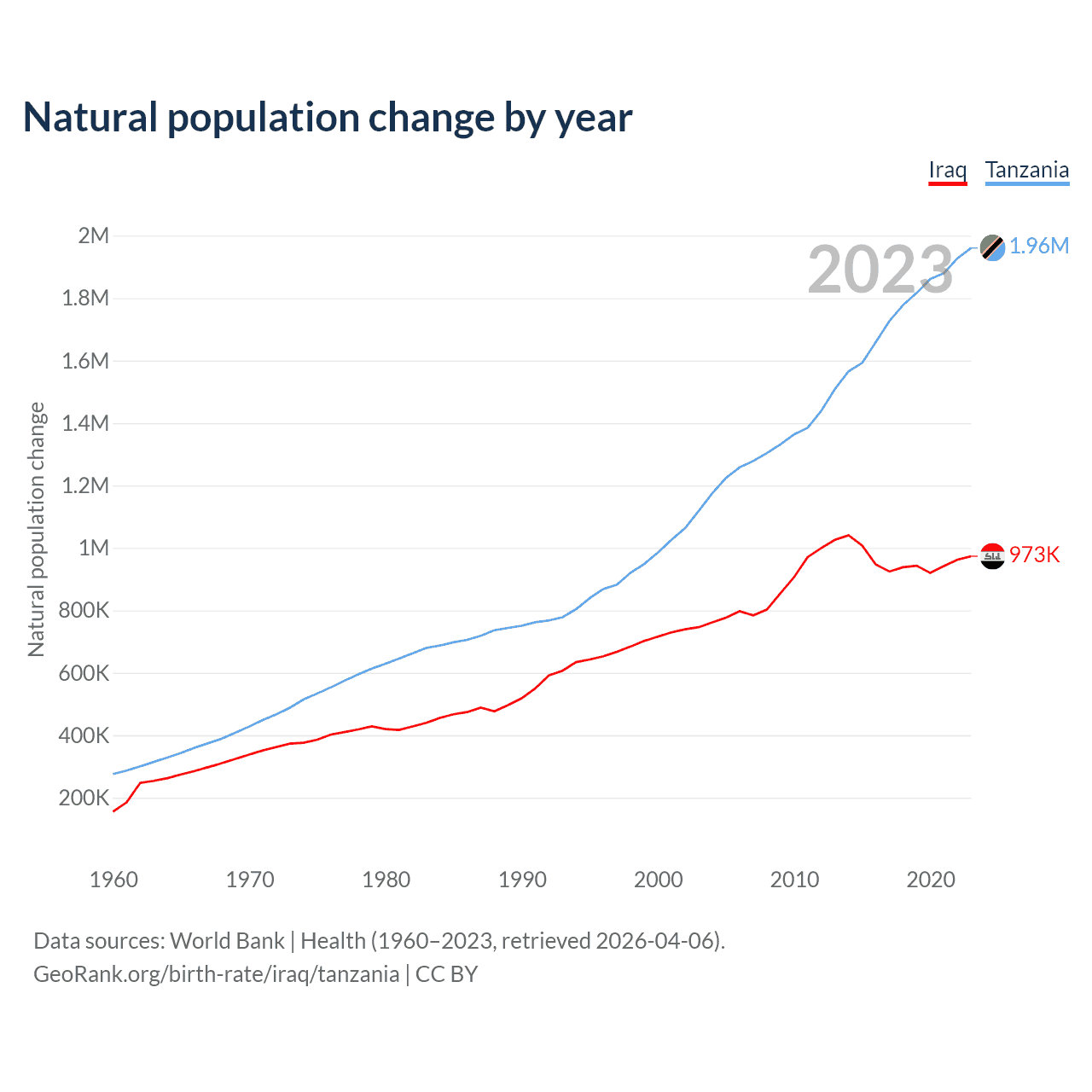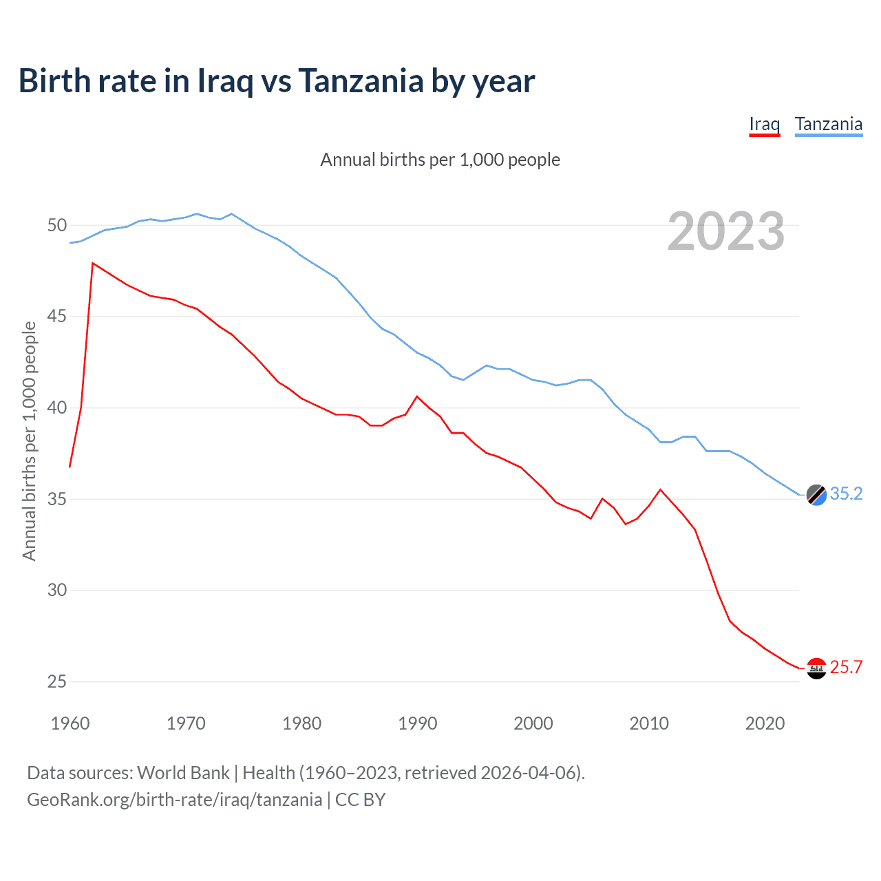 Iraq has an annual birth rate of 25.7 births per 1,000 people, compared to 35.2 for Tanzania. The average number of children a woman is expected to have during her lifetime — the fertility rate, is 3.25 in Iraq and 4.61 in Tanzania — 41.8% difference.