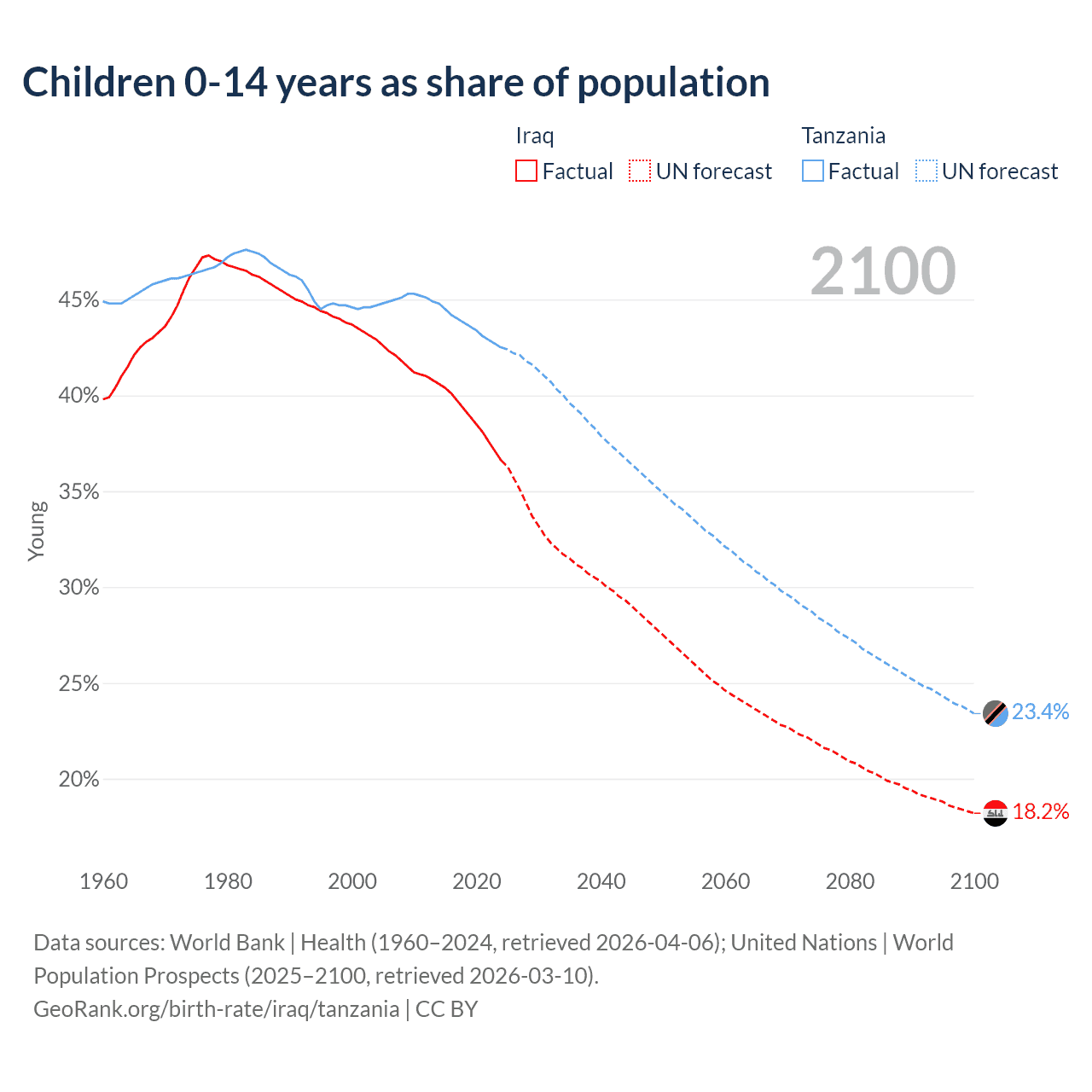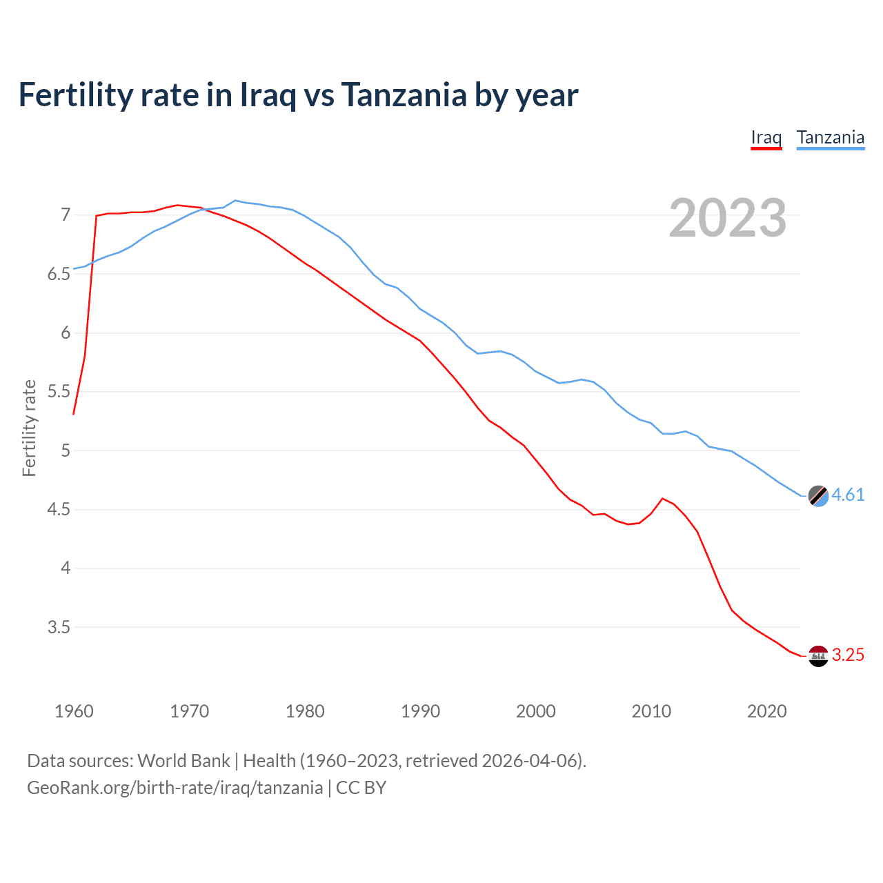According to the latest available data on birth rates, the fertility rate in Iraq was 3.25 children per woman in 2023, compared to 4.61 in Tanzania in 2023. The replacement level is considered to be 2.1 children per woman.