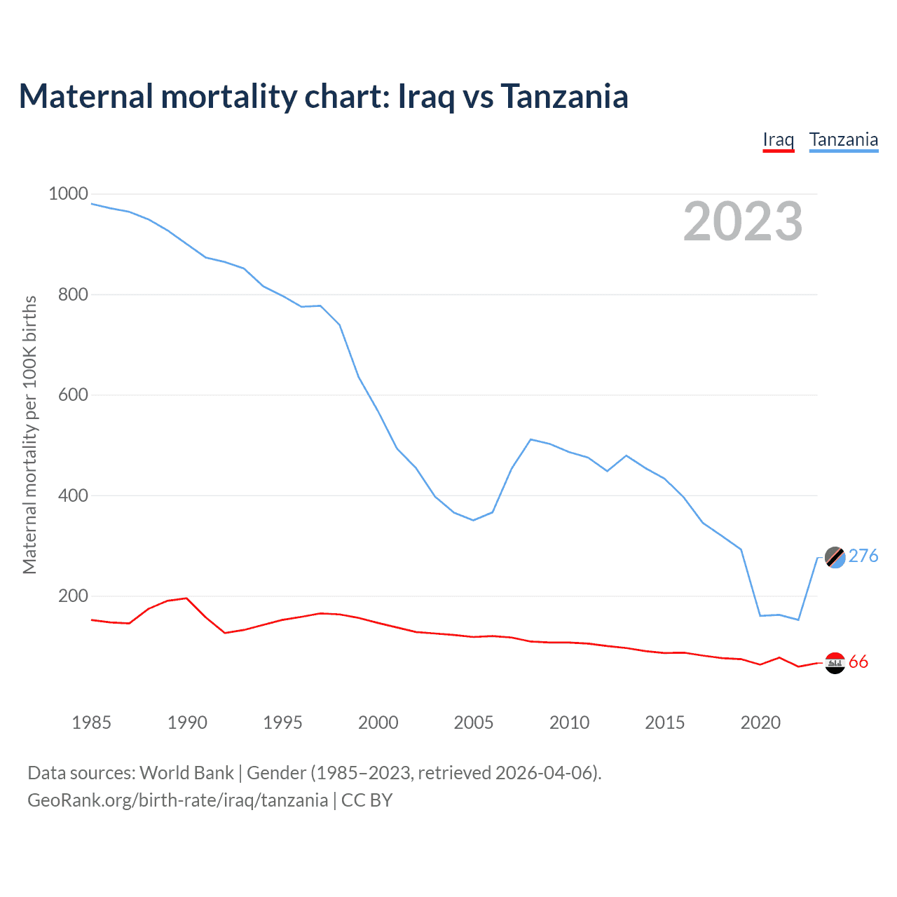 The maternal mortality rate, which is the probability of dying during childbirth or within 42 days of pregnancy termination, is 66 deaths per 100,000 live births in Iraq, compared to 276 deaths in Tanzania.