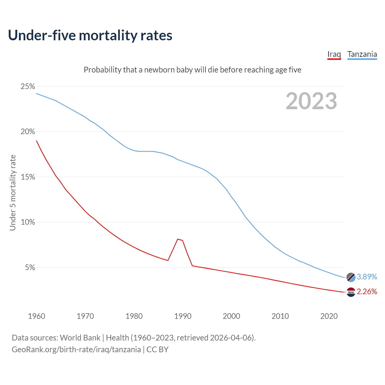 The chance that a newborn baby will die before reaching age five is 2.26% in Iraq and 3.89% in Tanzania. Above is a chart with historical data on under-five mortality rates.