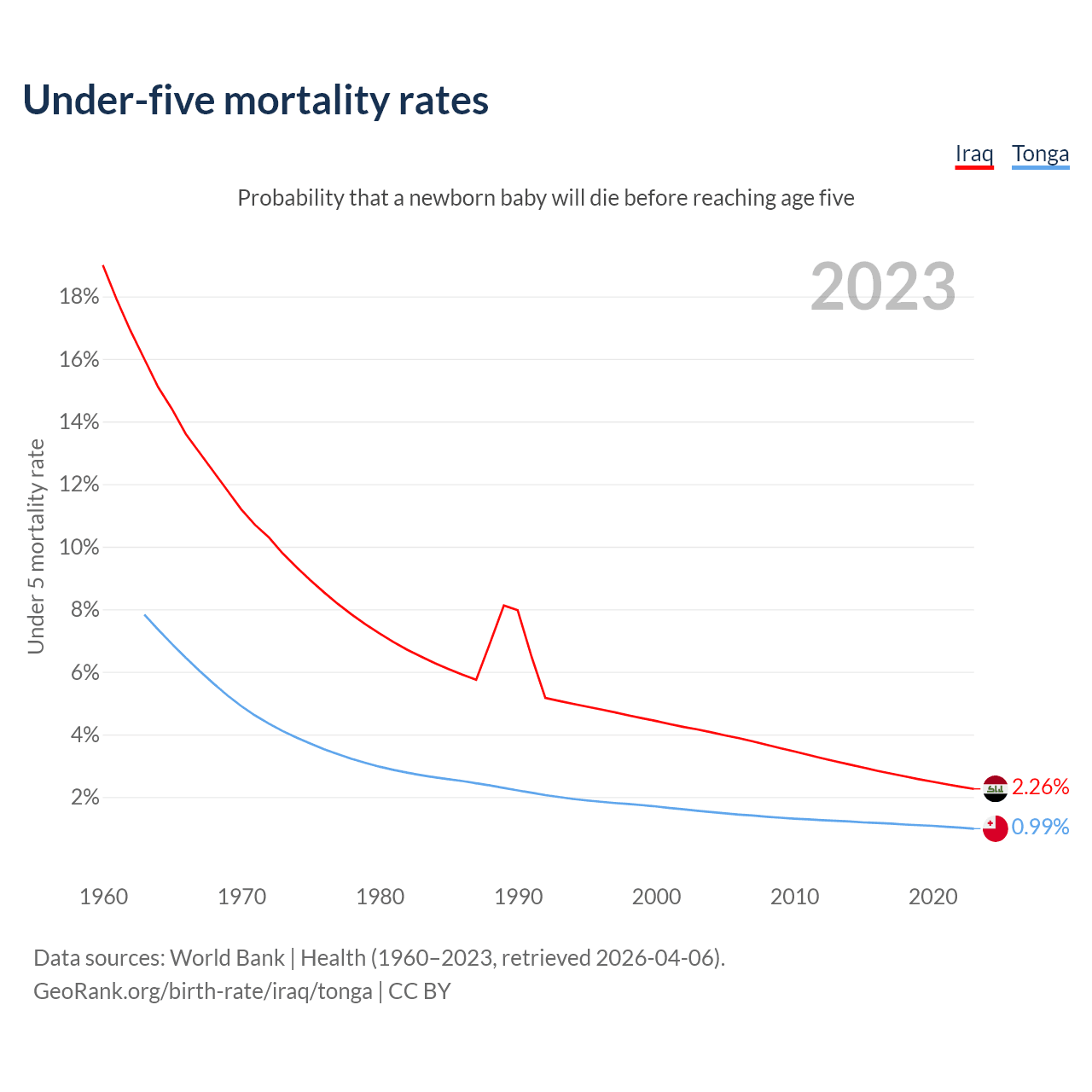The chance that a newborn baby will die before reaching age five is 2.26% in Iraq and 0.99% in Tonga. Above is a chart with historical data on under-five mortality rates.