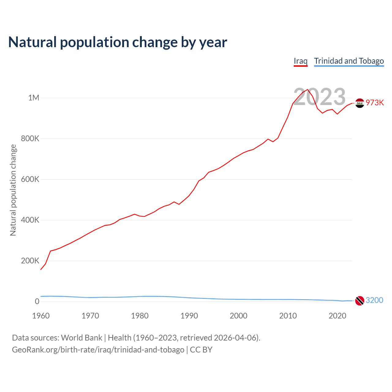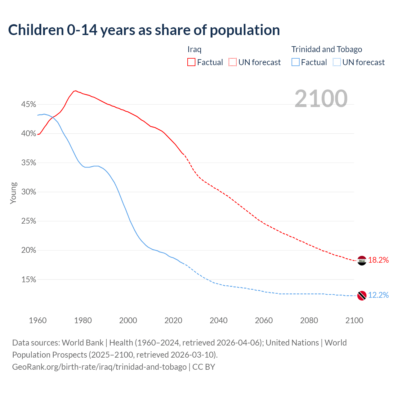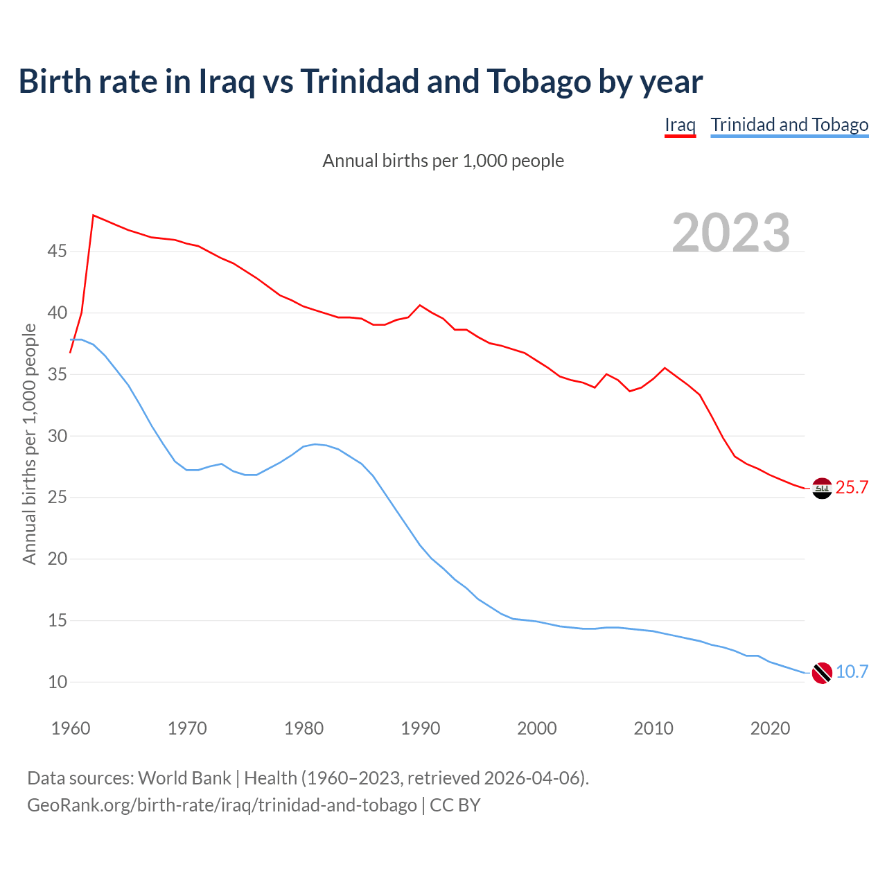 Iraq has an annual birth rate of 25.7 births per 1,000 people, compared to 10.7 for Trinidad and Tobago. The average number of children a woman is expected to have during her lifetime — the fertility rate, is 3.25 in Iraq and 1.53 in Trinidad and Tobago — 52.8% difference.