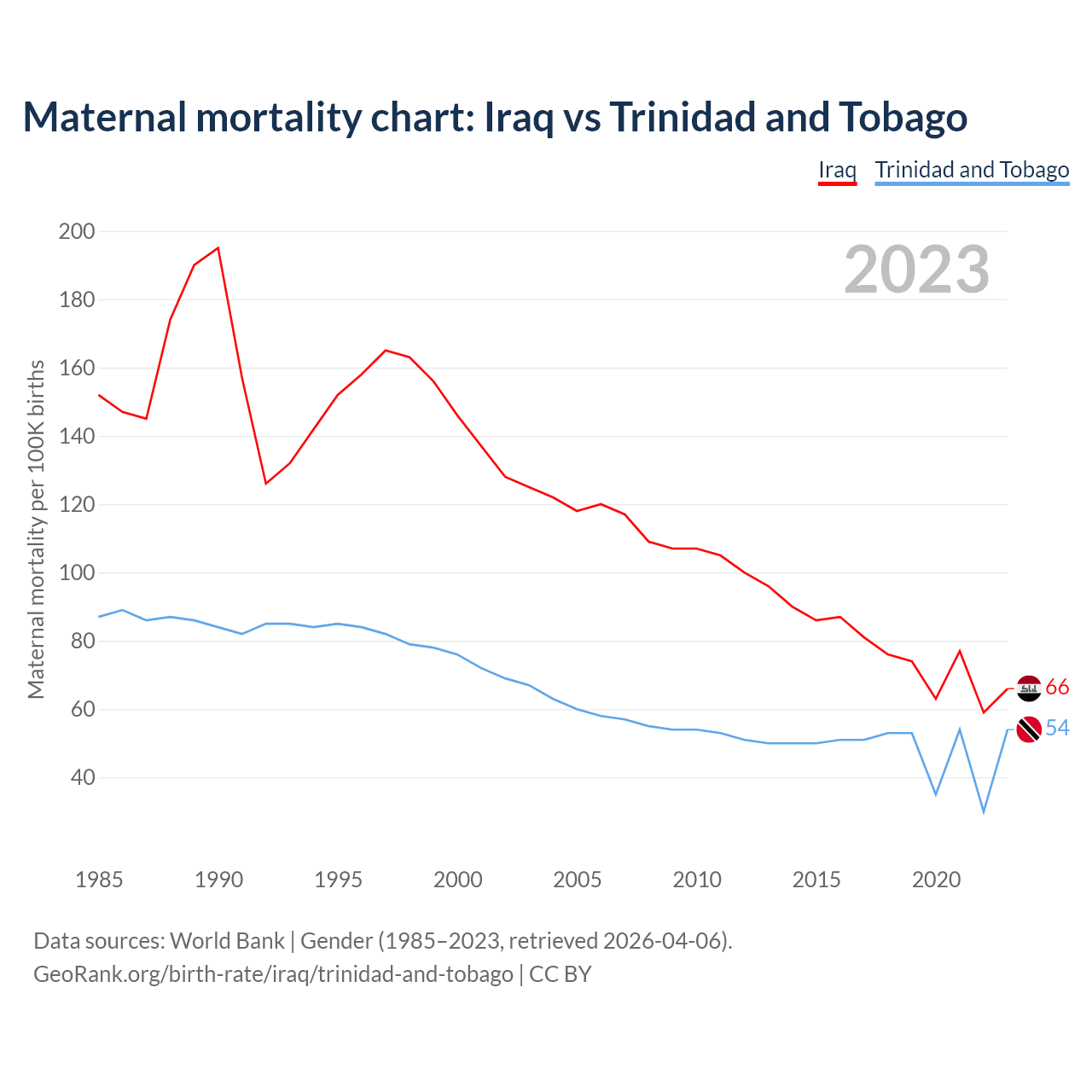 The maternal mortality rate, which is the probability of dying during childbirth or within 42 days of pregnancy termination, is 66 deaths per 100,000 live births in Iraq, compared to 54 deaths in Trinidad and Tobago.