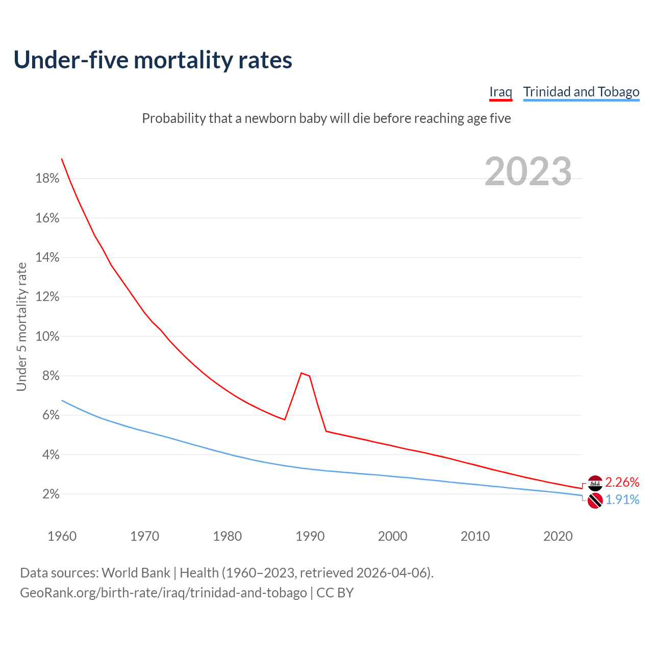 The chance that a newborn baby will die before reaching age five is 2.26% in Iraq and 1.91% in Trinidad and Tobago. Above is a chart with historical data on under-five mortality rates.