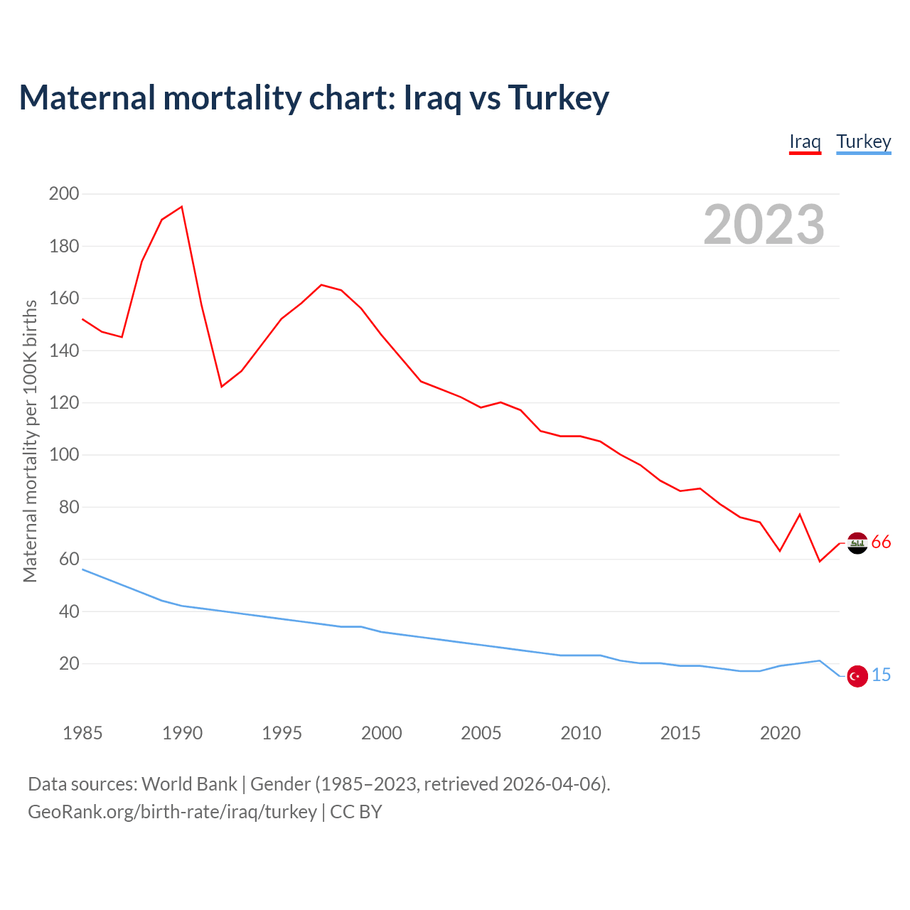 The maternal mortality rate, which is the probability of dying during childbirth or within 42 days of pregnancy termination, is 66 deaths per 100,000 live births in Iraq, compared to 15 deaths in Turkey.