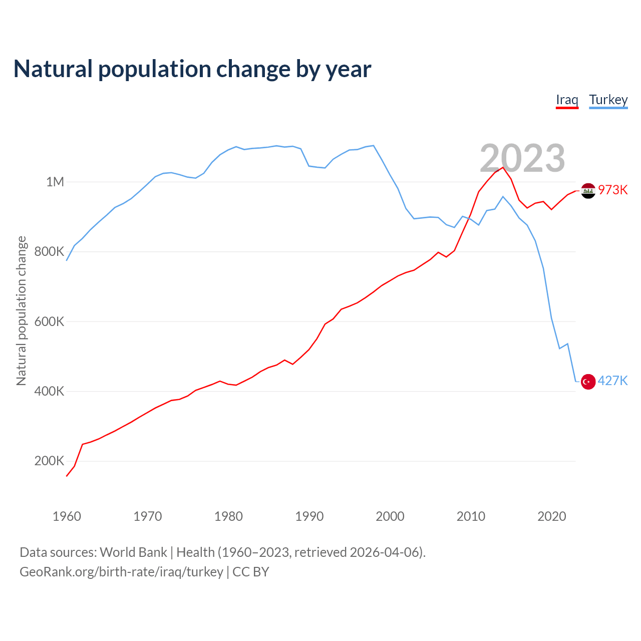 According to the latest available data on birth rates, the fertility rate in Iraq was 3.25 children per woman in 2023, compared to 1.51 in Turkey in 2023. The replacement level is considered to be 2.1 children per woman.