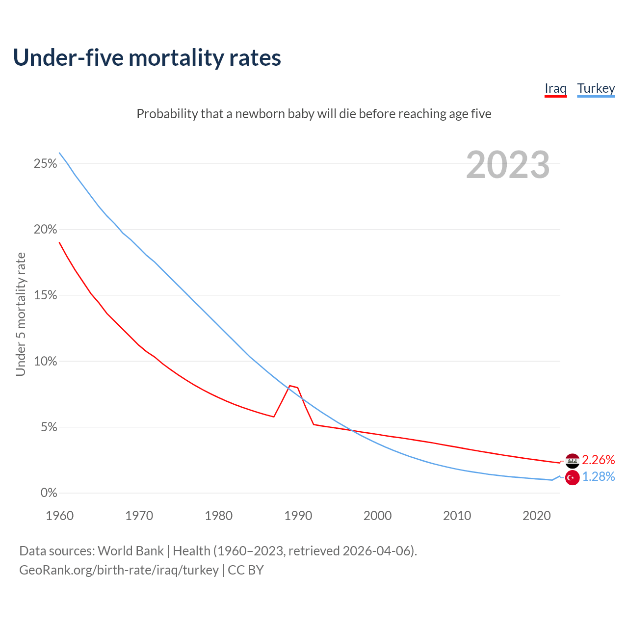 The chance that a newborn baby will die before reaching age five is 2.26% in Iraq and 1.28% in Turkey. Above is a chart with historical data on under-five mortality rates.