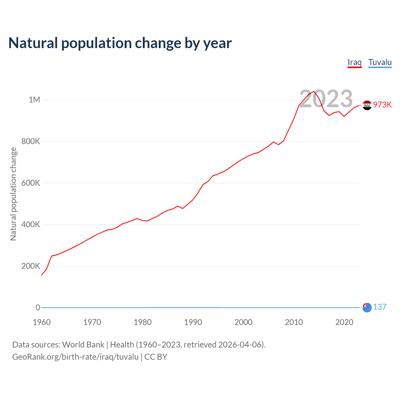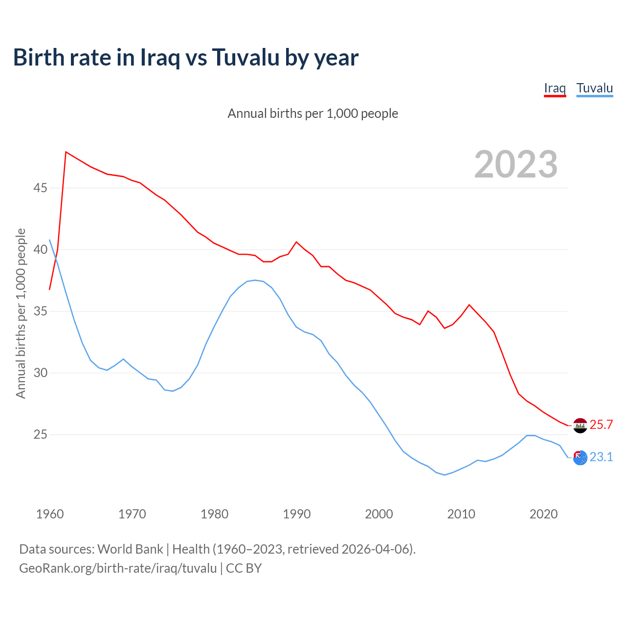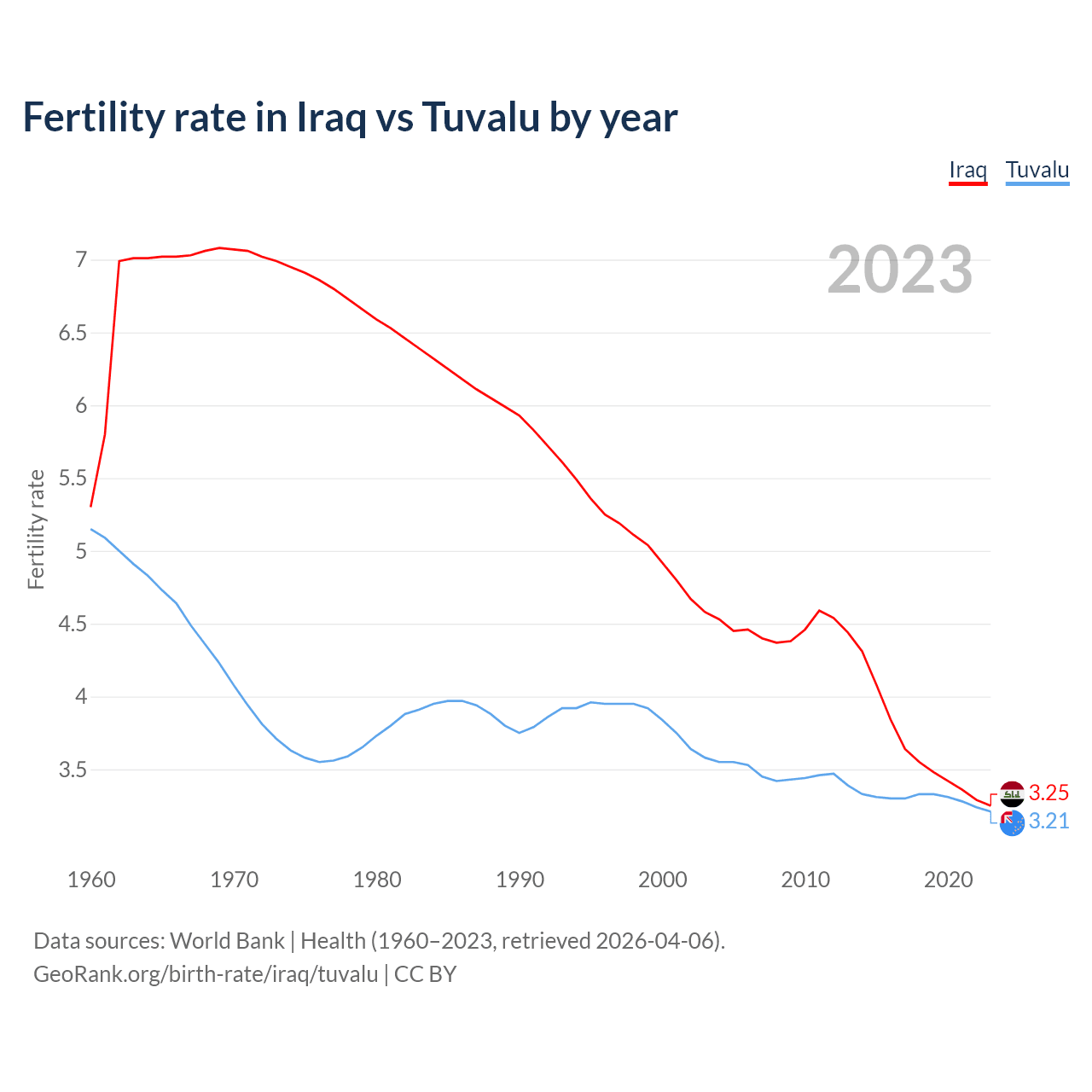 Iraq has an annual birth rate of 25.7 births per 1,000 people, compared to 23.1 for Tuvalu. The average number of children a woman is expected to have during her lifetime — the fertility rate, is 3.25 in Iraq and 3.21 in Tuvalu — 1.26% difference.