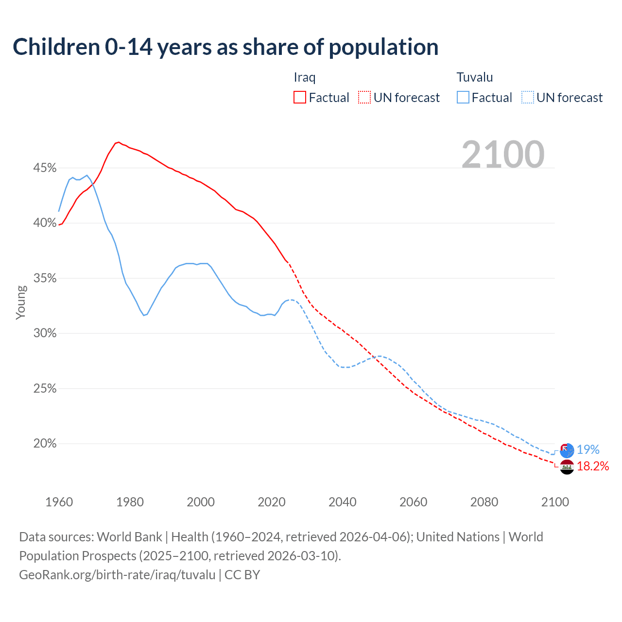 According to the latest available data on birth rates, the fertility rate in Iraq was 3.25 children per woman in 2023, compared to 3.21 in Tuvalu in 2023. The replacement level is considered to be 2.1 children per woman.