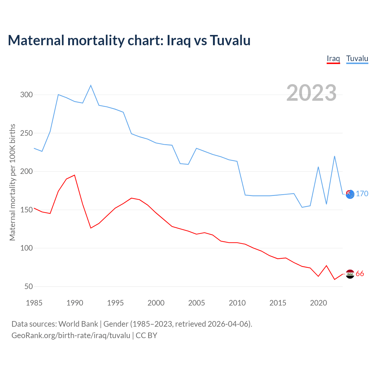 The maternal mortality rate, which is the probability of dying during childbirth or within 42 days of pregnancy termination, is 66 deaths per 100,000 live births in Iraq, compared to 170 deaths in Tuvalu.