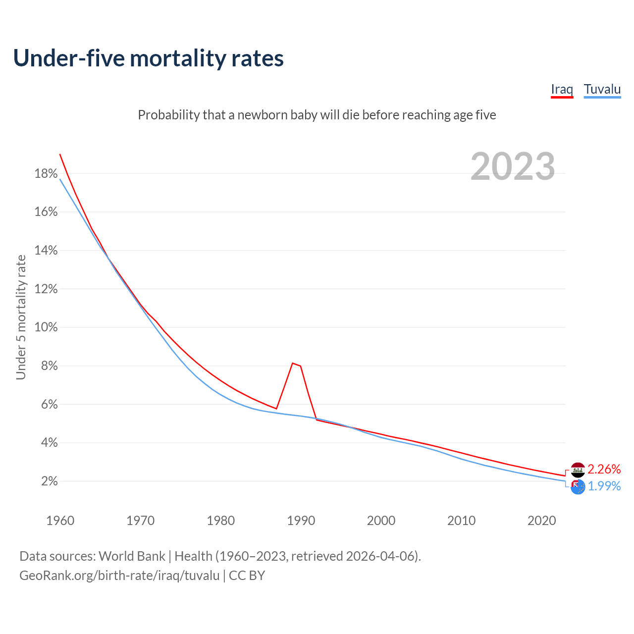 The chance that a newborn baby will die before reaching age five is 2.26% in Iraq and 1.99% in Tuvalu. Above is a chart with historical data on under-five mortality rates.