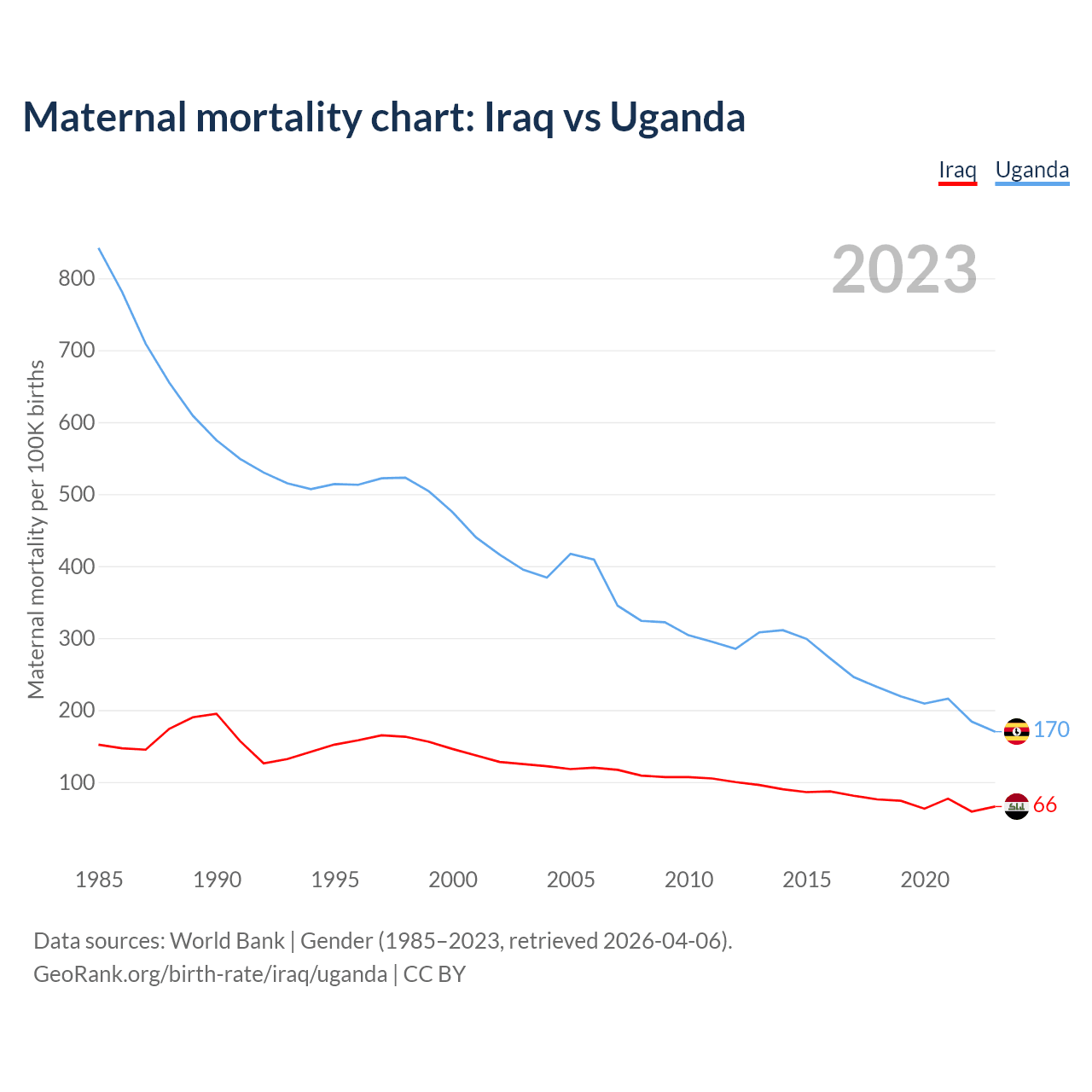 The maternal mortality rate, which is the probability of dying during childbirth or within 42 days of pregnancy termination, is 66 deaths per 100,000 live births in Iraq, compared to 170 deaths in Uganda.
