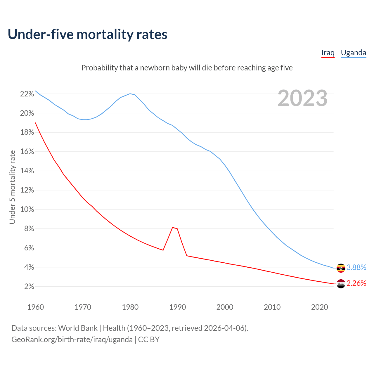 The chance that a newborn baby will die before reaching age five is 2.26% in Iraq and 3.88% in Uganda. Above is a chart with historical data on under-five mortality rates.