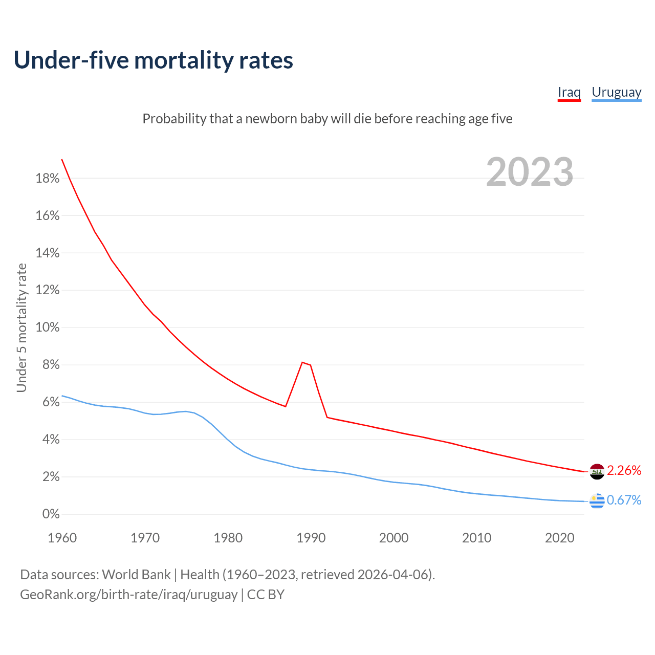The chance that a newborn baby will die before reaching age five is 2.26% in Iraq and 0.67% in Uruguay. Above is a chart with historical data on under-five mortality rates.