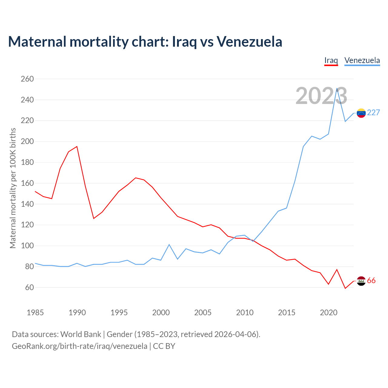 The maternal mortality rate, which is the probability of dying during childbirth or within 42 days of pregnancy termination, is 66 deaths per 100,000 live births in Iraq, compared to 227 deaths in Venezuela.
