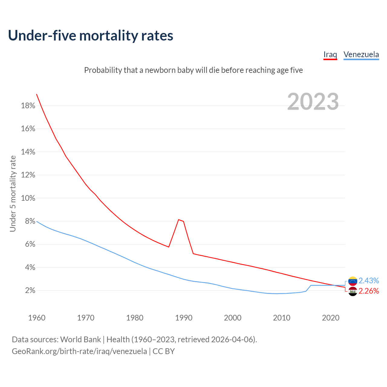 The chance that a newborn baby will die before reaching age five is 2.26% in Iraq and 2.43% in Venezuela. Above is a chart with historical data on under-five mortality rates.