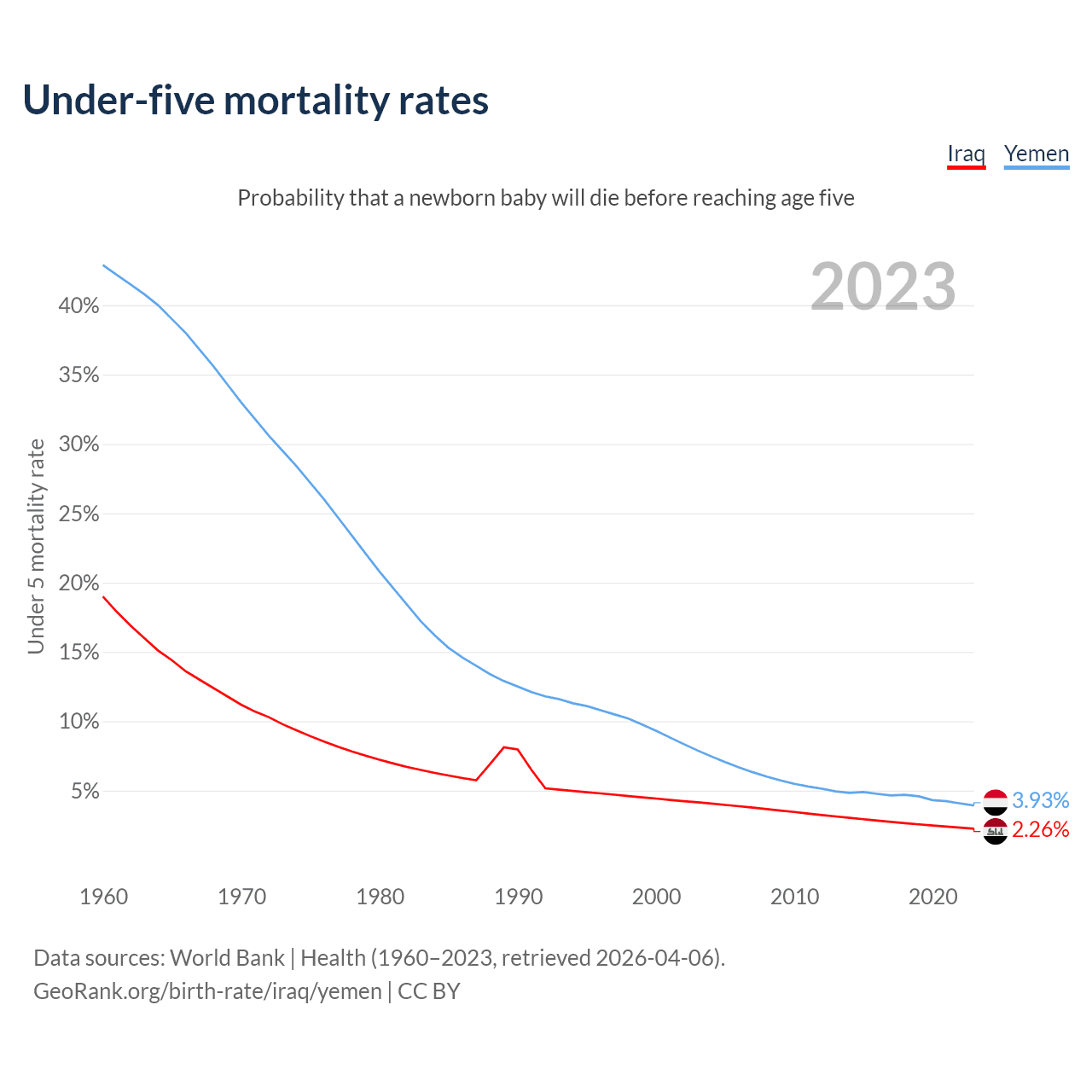 The chance that a newborn baby will die before reaching age five is 2.26% in Iraq and 3.93% in Yemen. Above is a chart with historical data on under-five mortality rates.