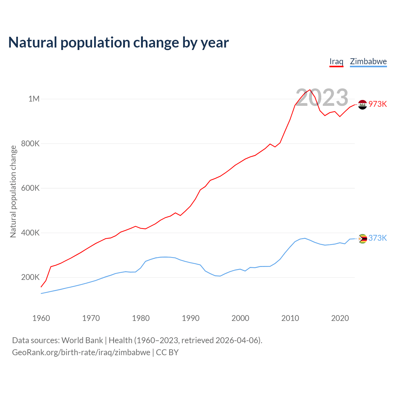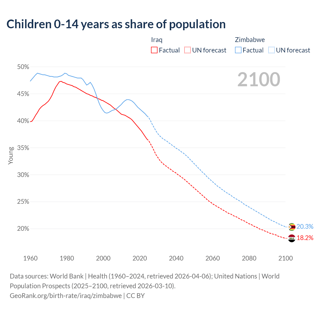 Iraq has an annual birth rate of 25.7 births per 1,000 people, compared to 30.4 for Zimbabwe. The average number of children a woman is expected to have during her lifetime — the fertility rate, is 3.25 in Iraq and 3.72 in Zimbabwe — 14.6% difference.