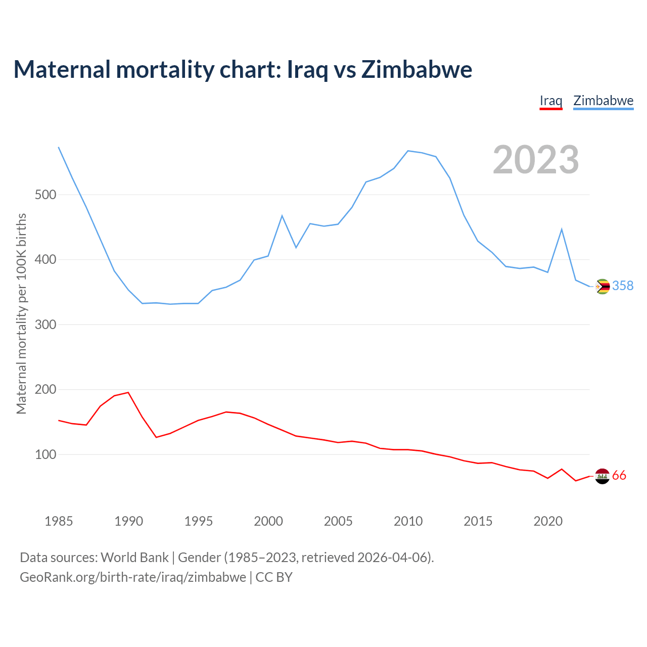 The maternal mortality rate, which is the probability of dying during childbirth or within 42 days of pregnancy termination, is 66 deaths per 100,000 live births in Iraq, compared to 358 deaths in Zimbabwe.