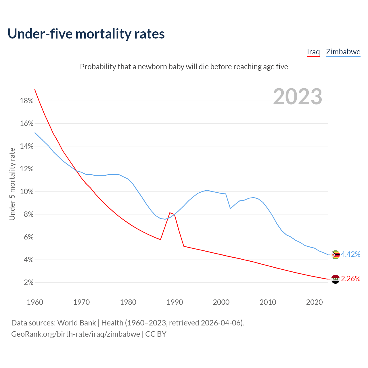 The chance that a newborn baby will die before reaching age five is 2.26% in Iraq and 4.42% in Zimbabwe. Above is a chart with historical data on under-five mortality rates.