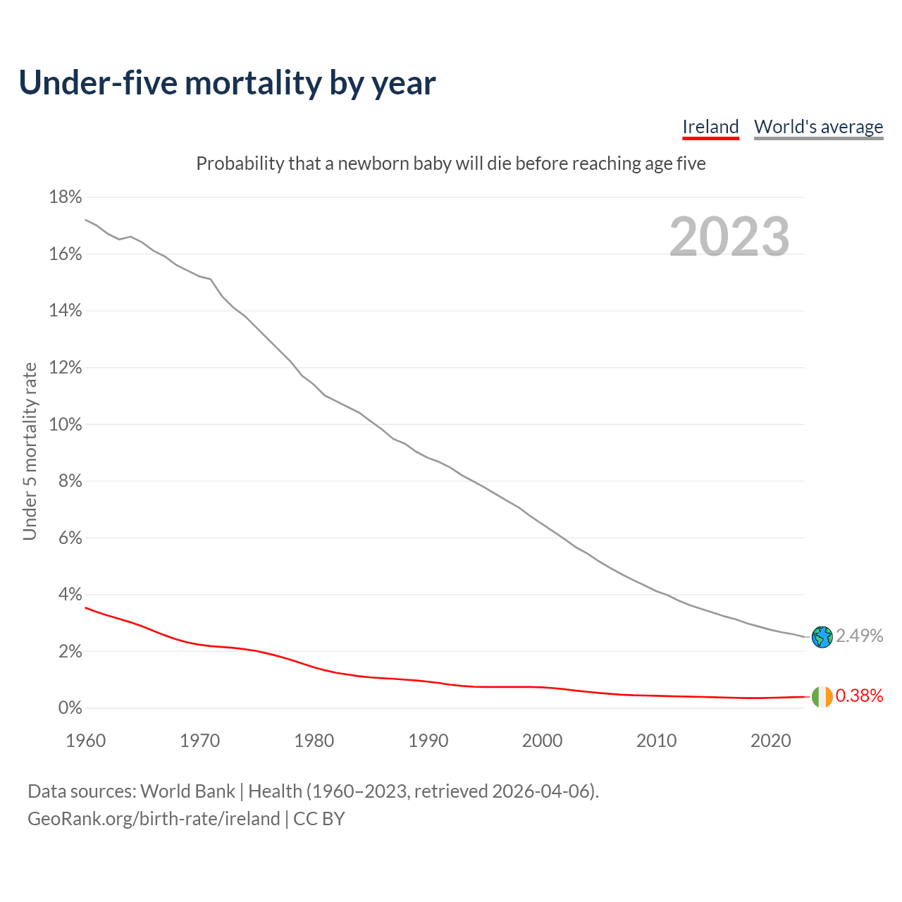The under-5 mortality rate in Ireland was 3.8 deaths per 1,000 live births in 2023 — a 0.38% chance that a newborn baby will die before reaching age five. This is down from 7.2 deaths per 1,000 live births in 2000.