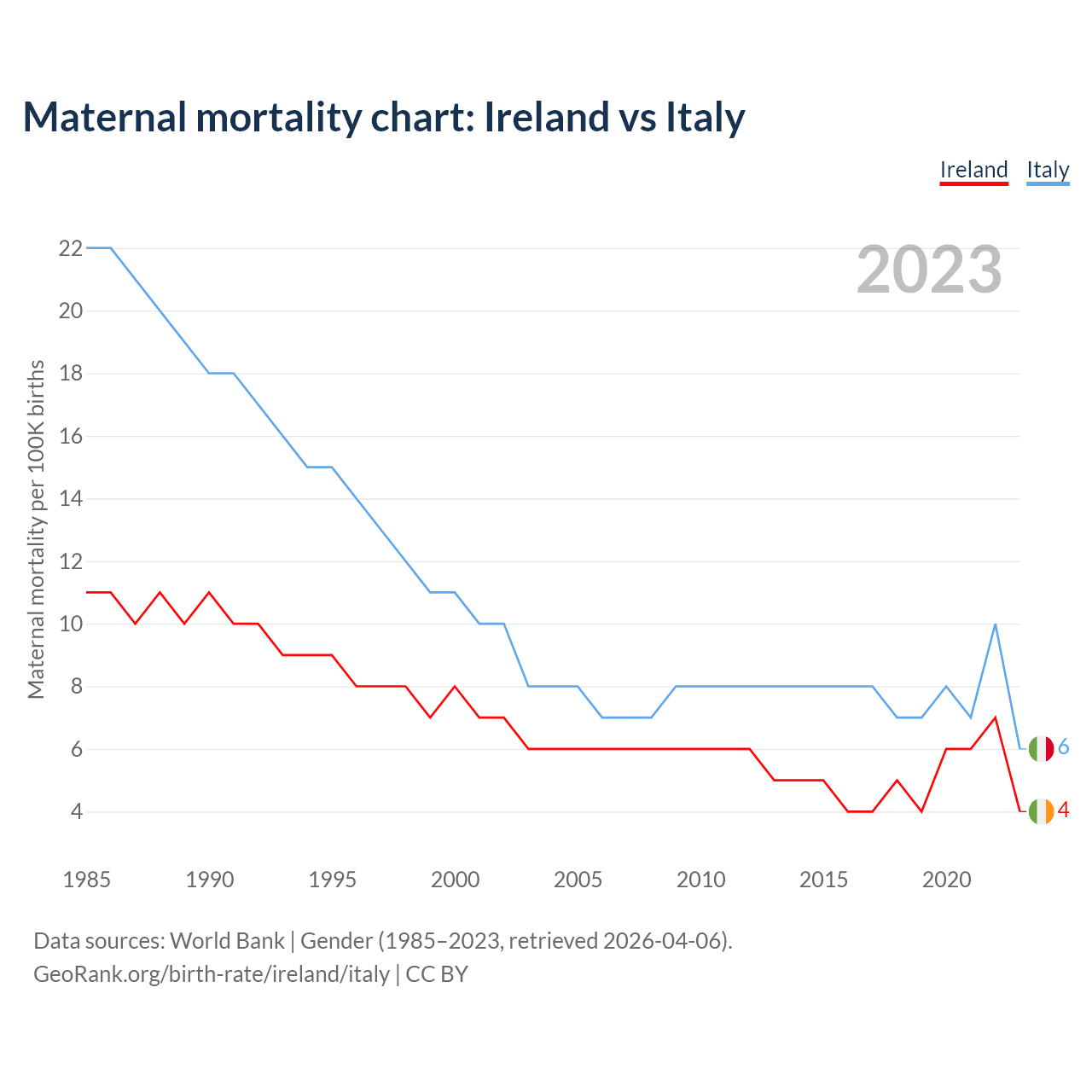 The maternal mortality rate, which is the probability of dying during childbirth or within 42 days of pregnancy termination, is 4 deaths per 100,000 live births in Ireland, compared to 6 deaths in Italy.