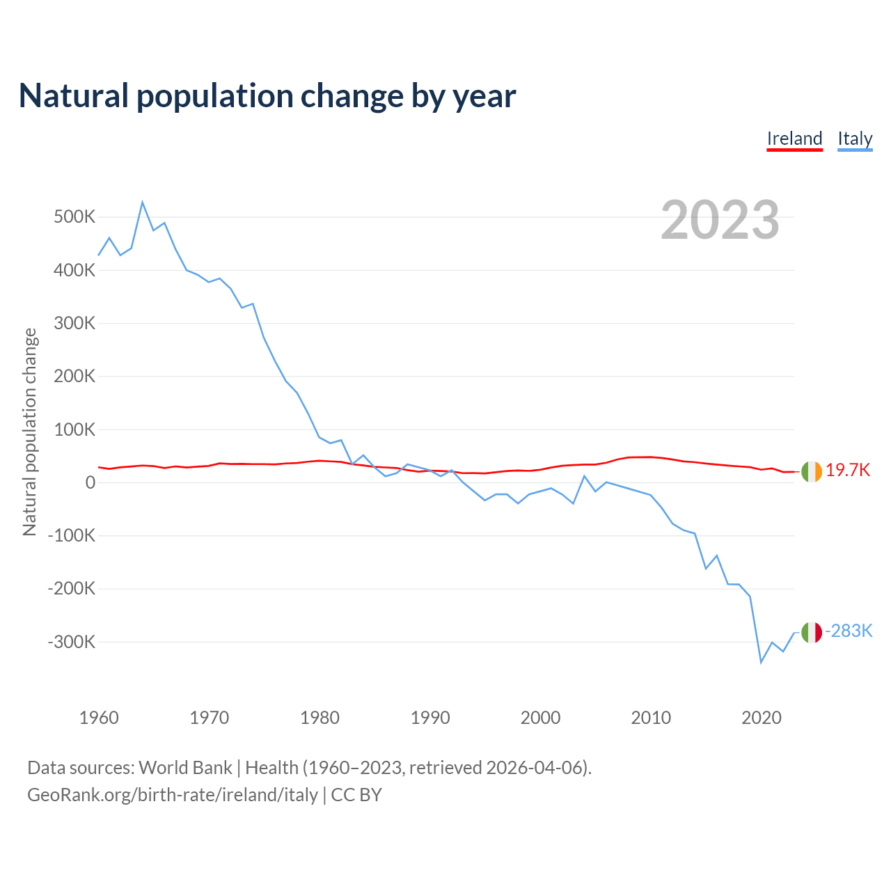 According to the latest available data on birth rates, the fertility rate in Ireland was 1.5 children per woman in 2023, compared to 1.2 in Italy in 2023. The replacement level is considered to be 2.1 children per woman.