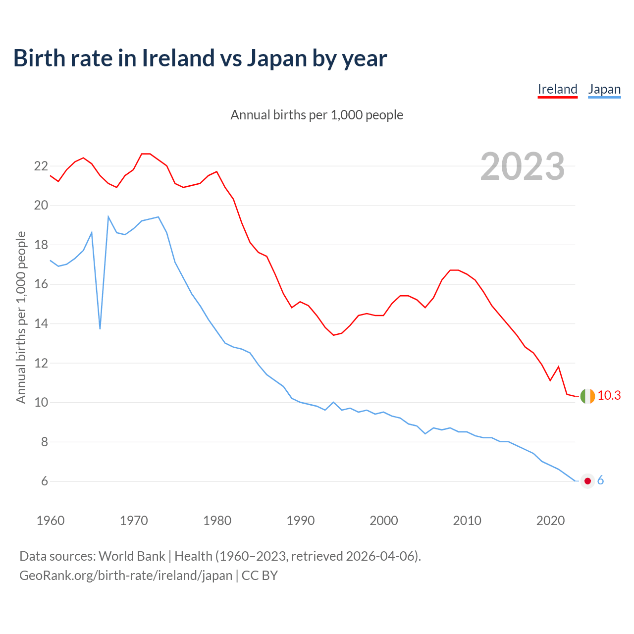 Ireland has an annual birth rate of 10.3 births per 1,000 people, compared to 6 for Japan. The average number of children a woman is expected to have during her lifetime — the fertility rate, is 1.5 in Ireland and 1.2 in Japan — 20% difference.