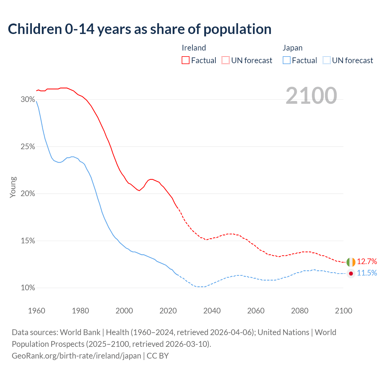 According to the latest available data on birth rates, the fertility rate in Ireland was 1.5 children per woman in 2023, compared to 1.2 in Japan in 2023. The replacement level is considered to be 2.1 children per woman.