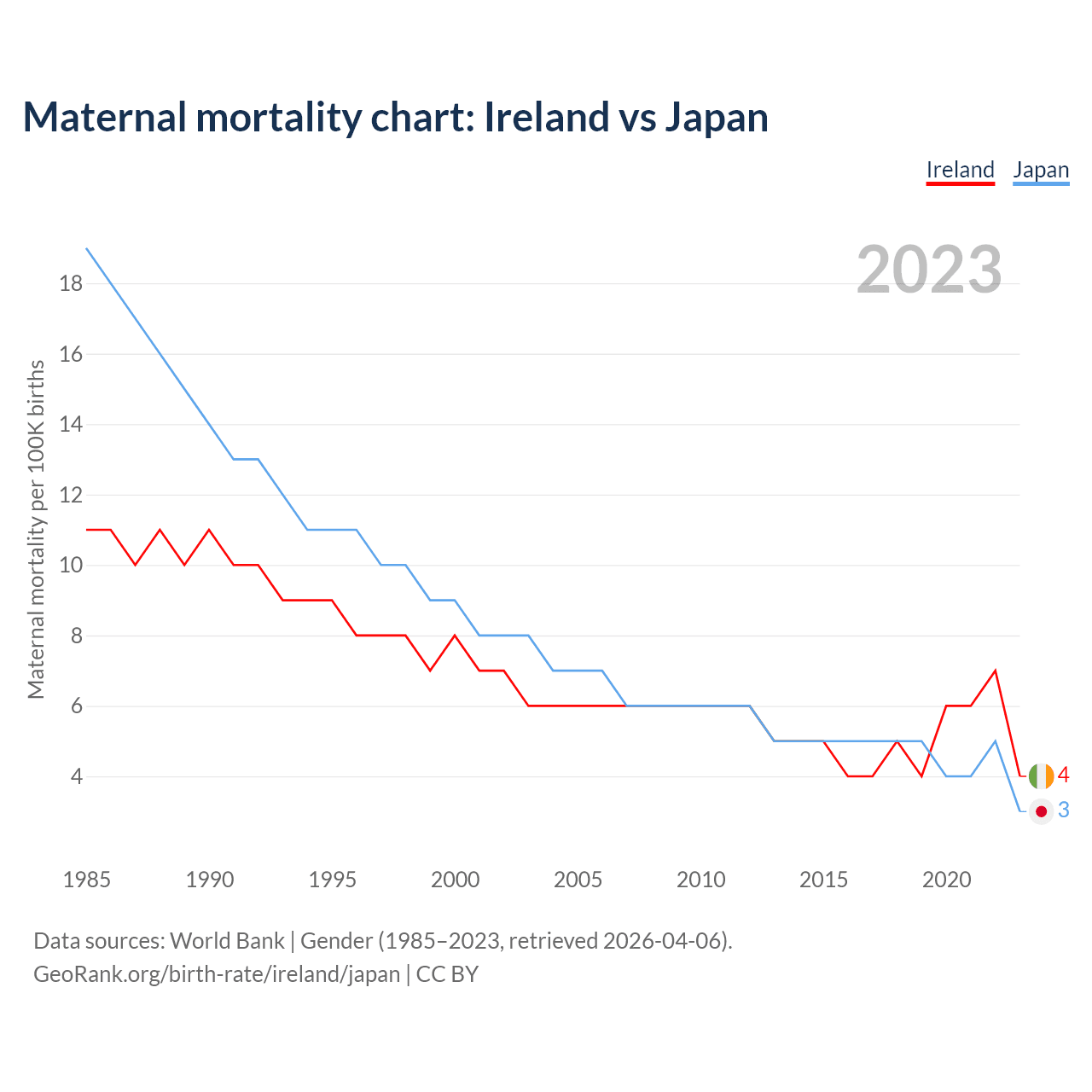 The maternal mortality rate, which is the probability of dying during childbirth or within 42 days of pregnancy termination, is 4 deaths per 100,000 live births in Ireland, compared to 3 deaths in Japan.