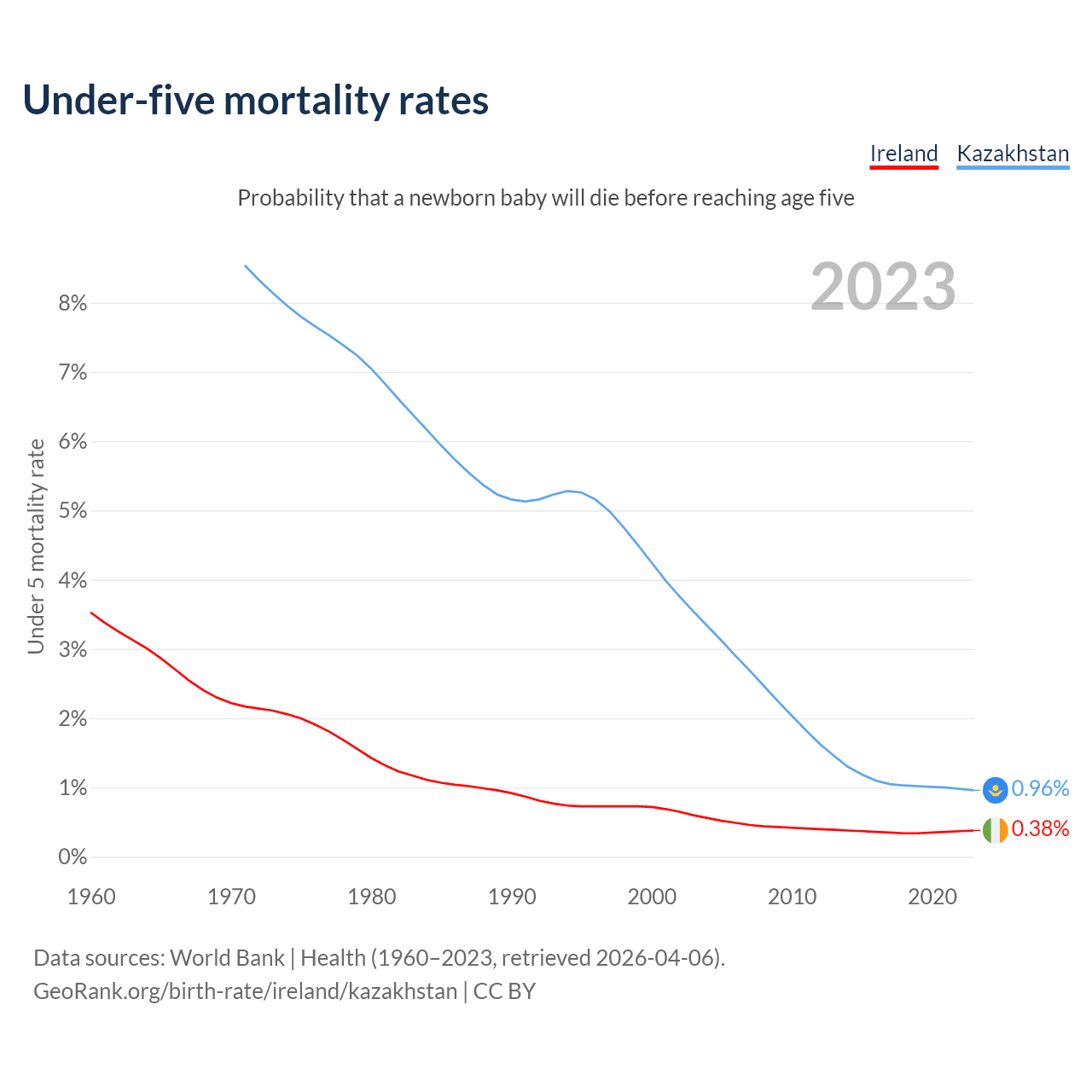 The chance that a newborn baby will die before reaching age five is 0.38% in Ireland and 0.96% in Kazakhstan. Above is a chart with historical data on under-five mortality rates.