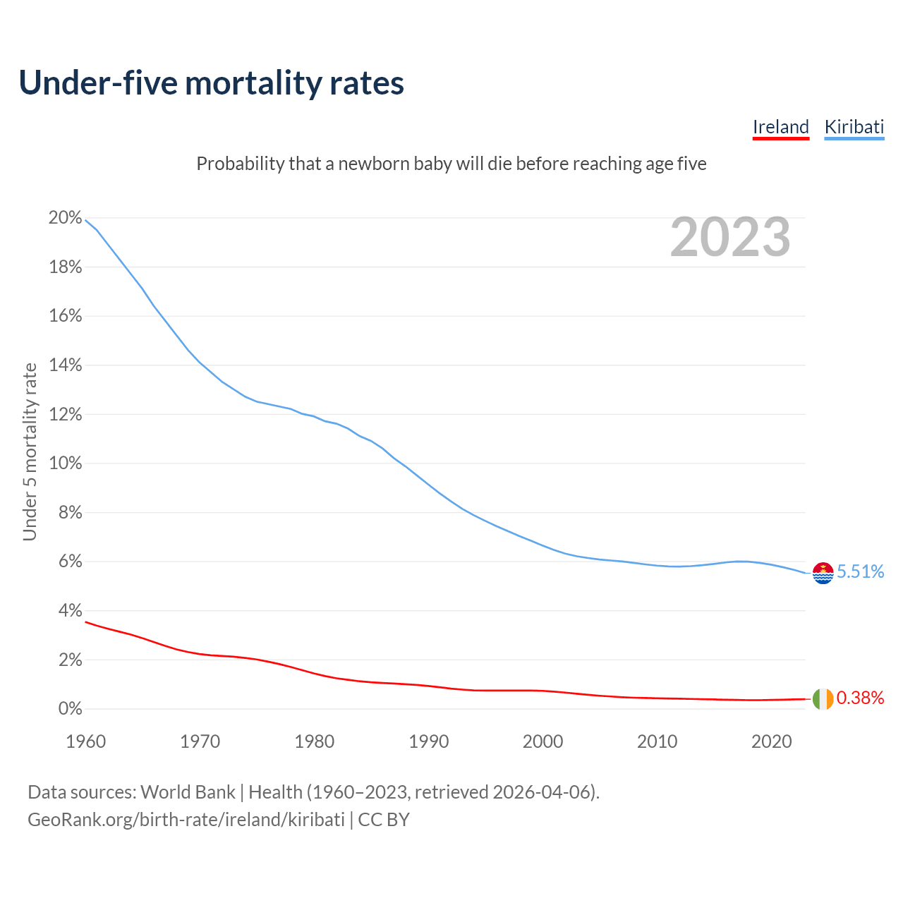 The chance that a newborn baby will die before reaching age five is 0.38% in Ireland and 5.51% in Kiribati. Above is a chart with historical data on under-five mortality rates.