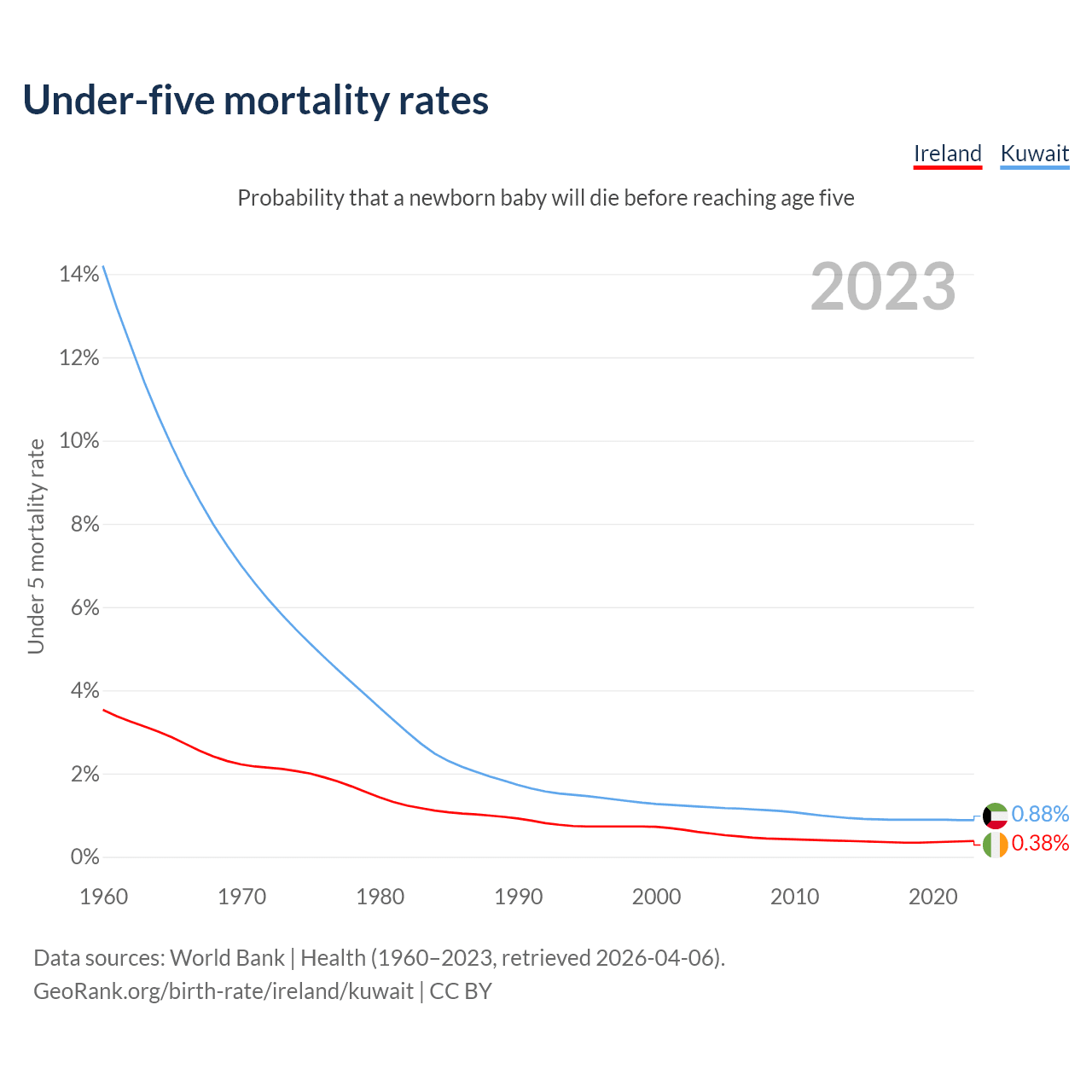 The chance that a newborn baby will die before reaching age five is 0.38% in Ireland and 0.88% in Kuwait. Above is a chart with historical data on under-five mortality rates.