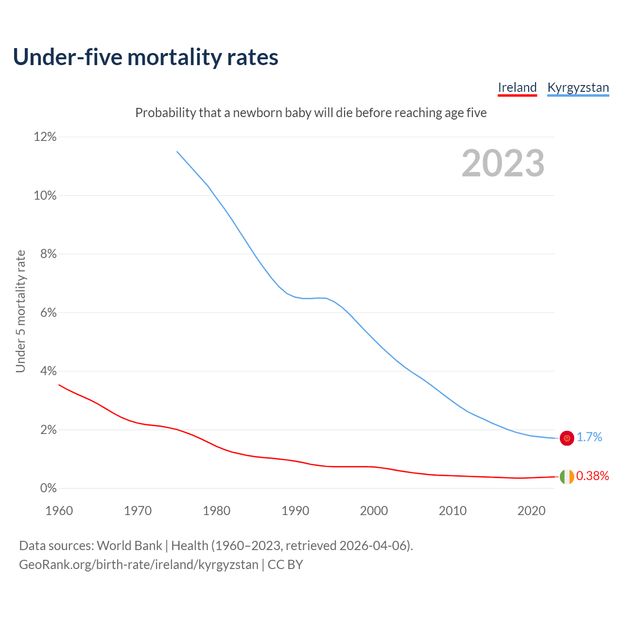 The chance that a newborn baby will die before reaching age five is 0.38% in Ireland and 1.7% in Kyrgyzstan. Above is a chart with historical data on under-five mortality rates.