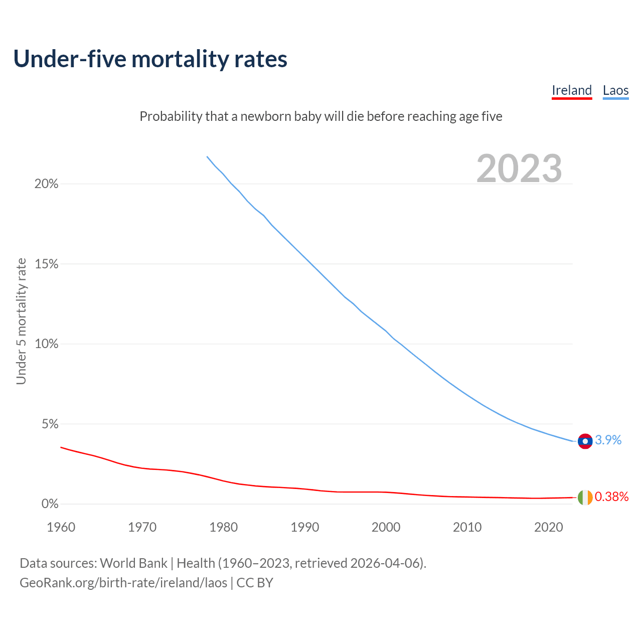 The chance that a newborn baby will die before reaching age five is 0.38% in Ireland and 3.9% in Laos. Above is a chart with historical data on under-five mortality rates.