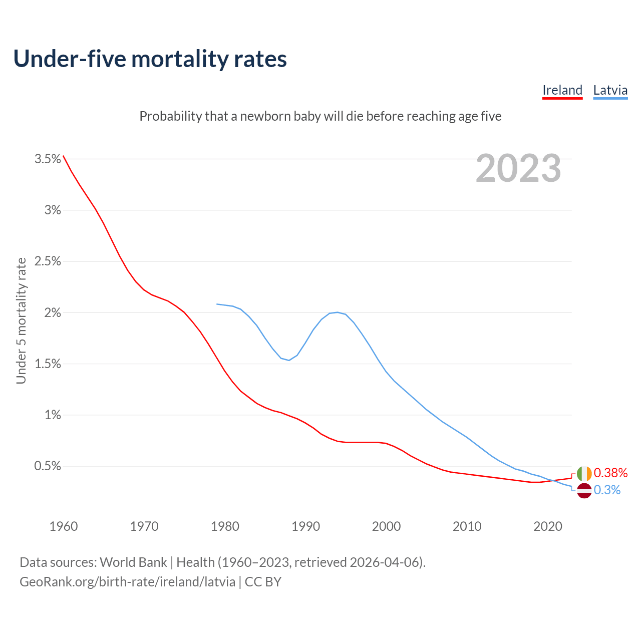 The chance that a newborn baby will die before reaching age five is 0.38% in Ireland and 0.3% in Latvia. Above is a chart with historical data on under-five mortality rates.