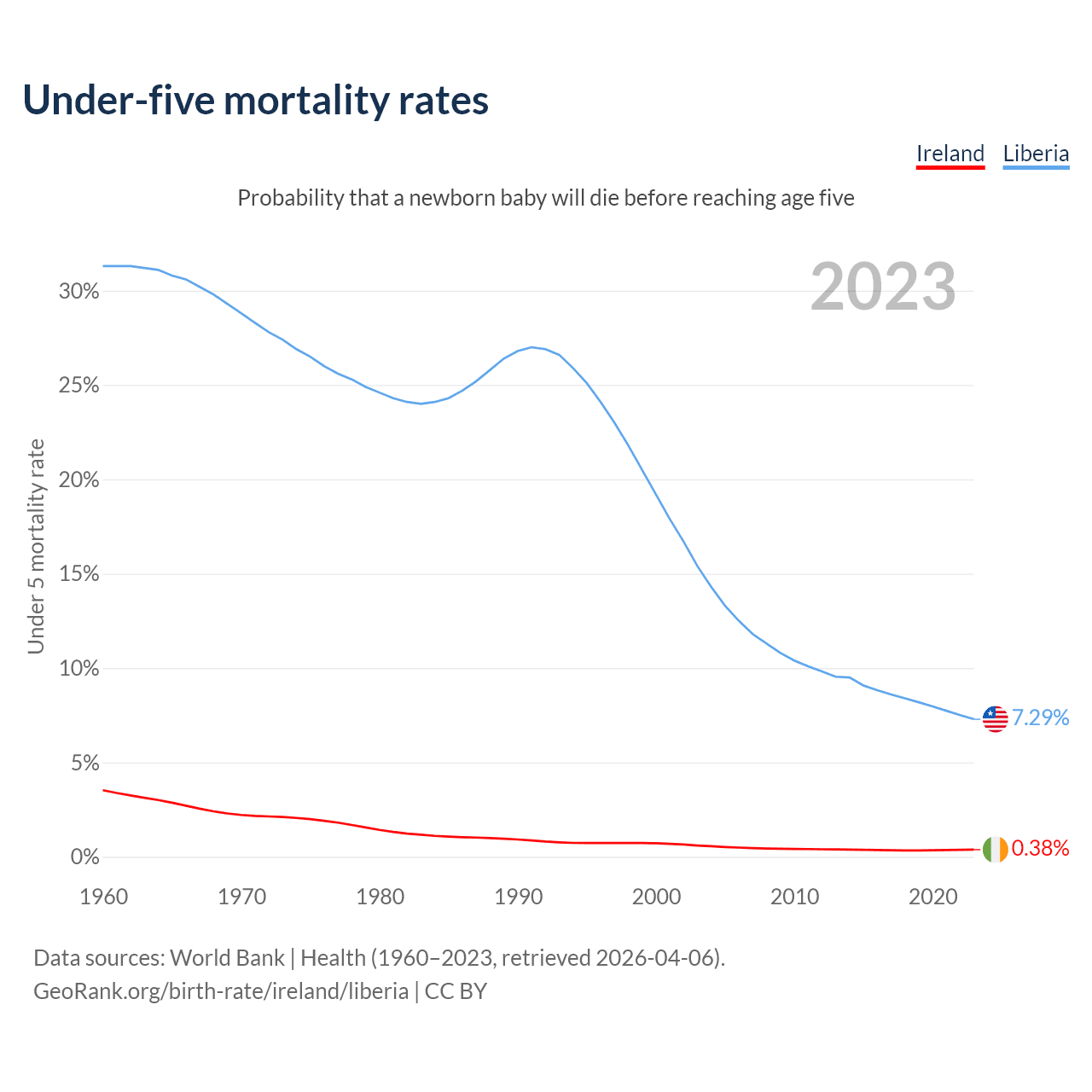 The chance that a newborn baby will die before reaching age five is 0.38% in Ireland and 7.29% in Liberia. Above is a chart with historical data on under-five mortality rates.