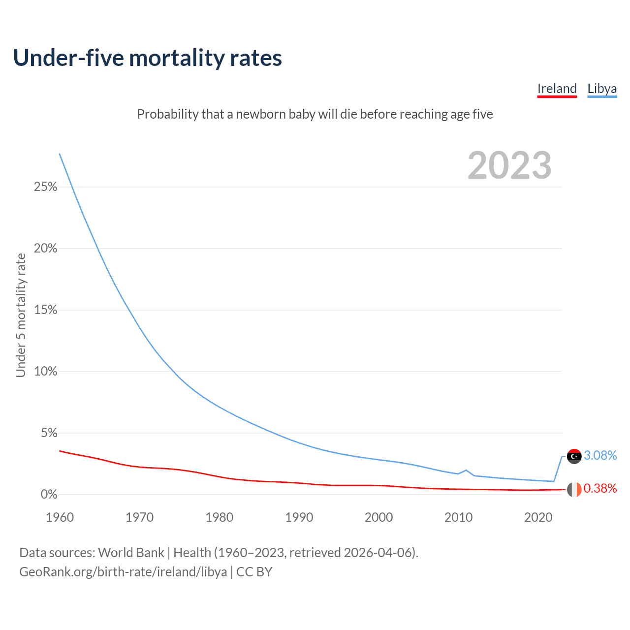 The chance that a newborn baby will die before reaching age five is 0.38% in Ireland and 3.08% in Libya. Above is a chart with historical data on under-five mortality rates.