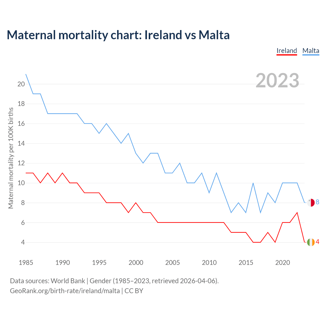 The maternal mortality rate, which is the probability of dying during childbirth or within 42 days of pregnancy termination, is 4 deaths per 100,000 live births in Ireland, compared to 8 deaths in Malta.